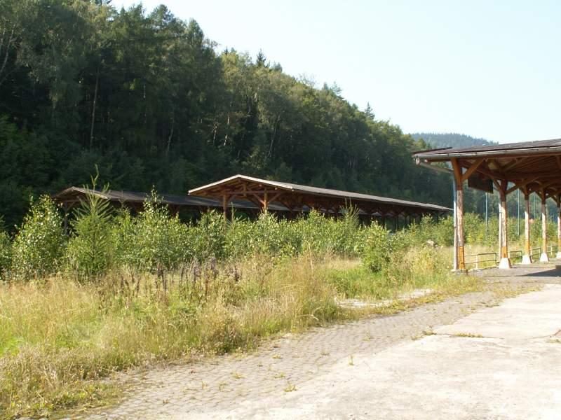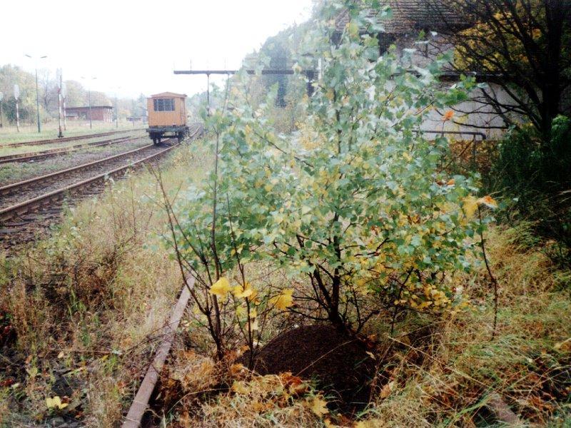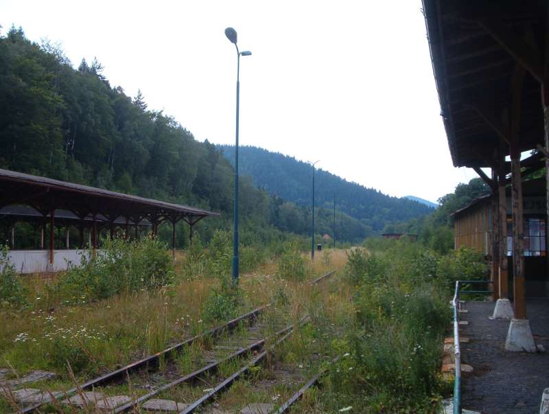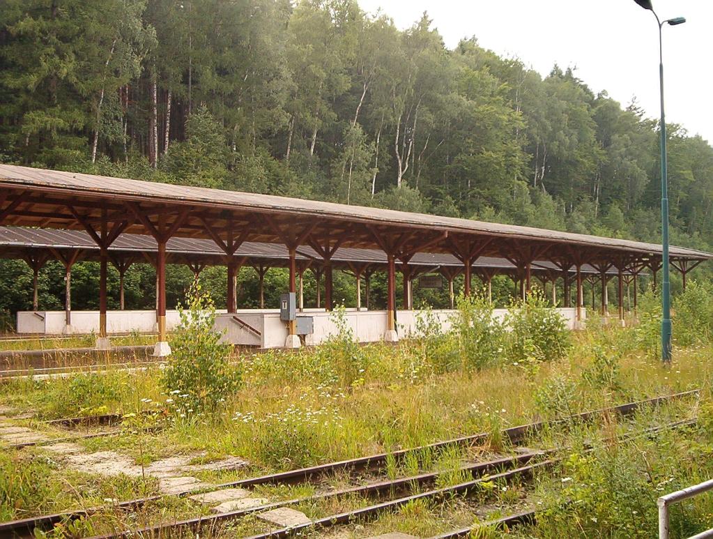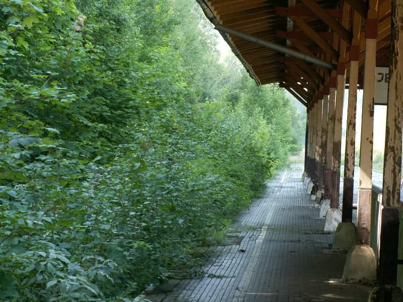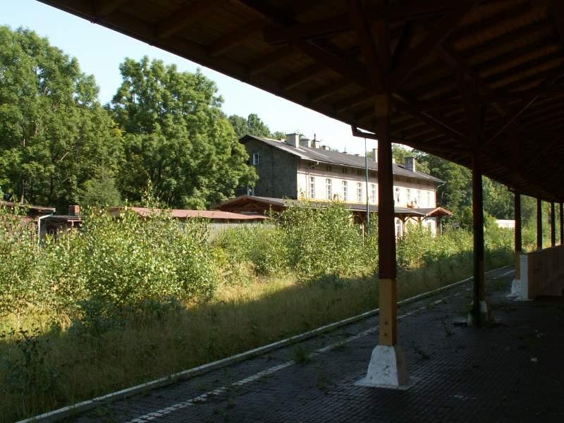 Nieczynny peron 1 i zarastające tory. W tle budynek dworca. Widok w kierunku południowo-wschodnim, od strony wjazdów z Wałbrzycha i Jugowic/Świdnicy.