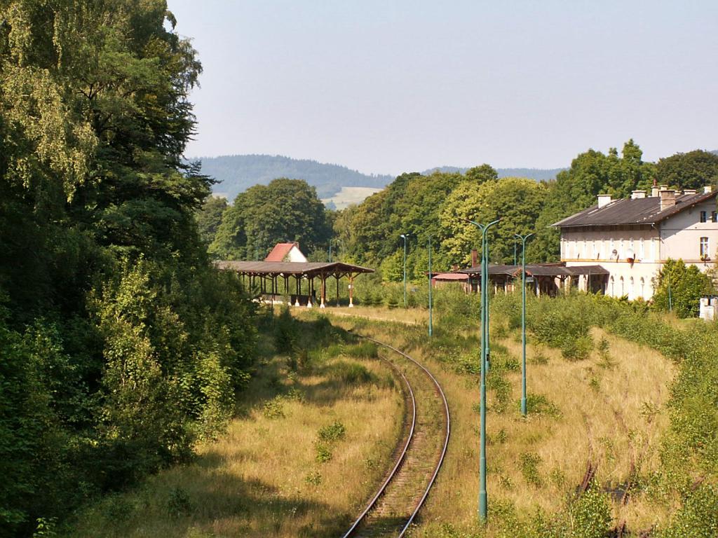 Widok na stację w kierunku północno-zachodnim, od strony wjazdu z Głuszycy/Kłodzka. Z prawej budynek dworca.