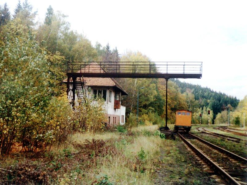 Opuszczona nastawnia wykonawcza JZ1 i semafory wyjazdowe. Widok w kierunku wschodnim: w lewo dworzec i perony, w prawo Głuszyca/Kłodzko.