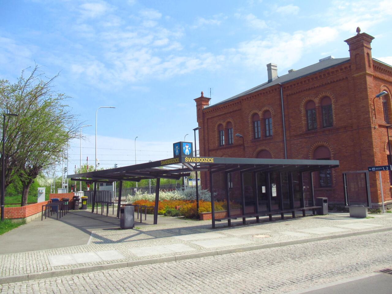 2018-01: Wyburzono betonową zaporę zbudowaną w okresie II wojny światowej. Początkowo pociągi do Wrocławia, a potem również Wałbrzycha odjeżdżały ze starego, ślepego, dworca. W ogródkach działkowych, znajdujących się obok dzisiejszych torów, zachowały się ślady po linii która wychodziła ze starego dworca i wchodziła w dolinę Lubiechowskiej Wody. Czyli, że początkowo pociągi zmieniały kierunek jazdy na stacji w Świebodzicach. Istniał nawet trójkąt torów pozwalający jechać do Wałbrzycha z pominięciem dworca Świebodzice. Nie widziałem stacji, gdzie pociąg zatrzymuje się na tak dużym przechyle. (info: Marcin Czech, 21-04-2008) Dopiero w okresie przebudowy linii na dwutorową przebudowano całą linię w obrębie Świebodzic, aby umożliwić bezmanewrową jazdę do Wałbrzycha. To wówczas postawiono nowy dworzec. Dworzec ten znajduje się nieco dalej od centrum i służy podróżnym do dziś. Stary dworzec początkowo zamieniono na Dworzec Towarowy, a obecnie znajdują się w nim mieszkania. Pomimo, iż stacja znajduje się na łuku o małym promieniu zlikwidowano stanowisko dyżurnego ruchu peronowego. Dworzec, jak już wcześniej wspomniano znajduje się na uboczu miasta. W pobliżu znajdują się zakłady przemysłowe i ogrody działkowe. (info: wasiukibic, 23-09-2008). |