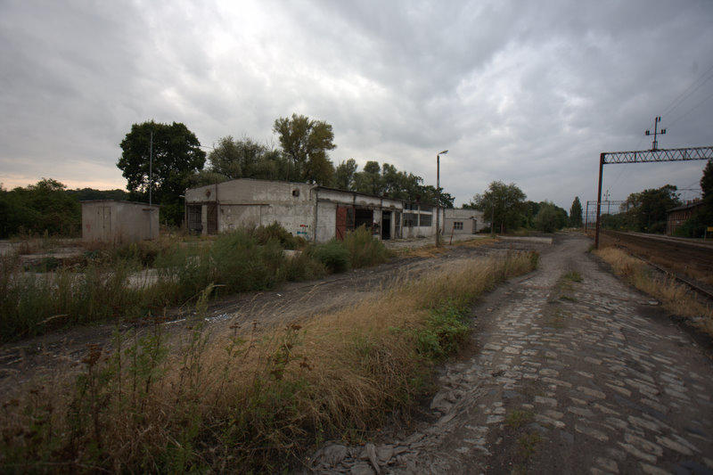 Plac przeładunkowy i zdewastowane budynki ekspedycji towarowej. Widok w kierunku północno-wschodnim (Zbąszynek). Z prawej, poza kadrem, dworzec.