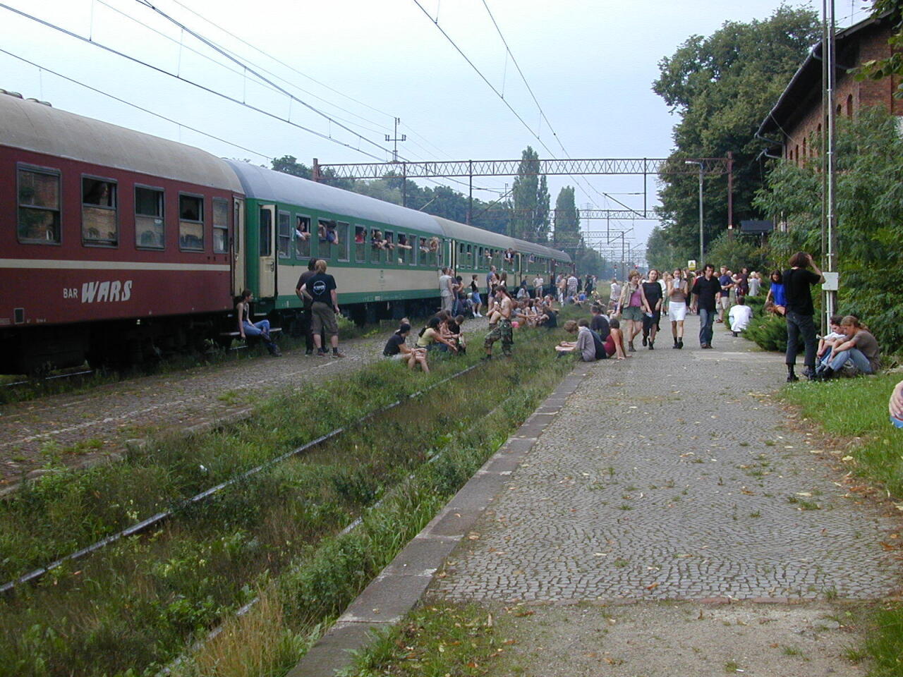 Przerwa w podróży. Pociąg (specjalny? WARS?) z Poznania na Przystanek Woodstock 2002 w Żarach. W Zielonej Górze przesiadka do bipy. Widok w kierunku Zbąszynka/Poznania.