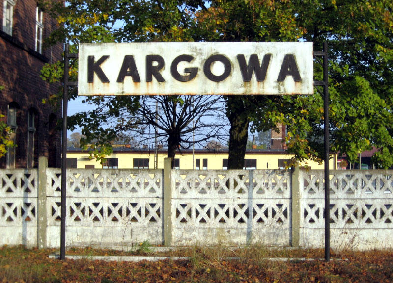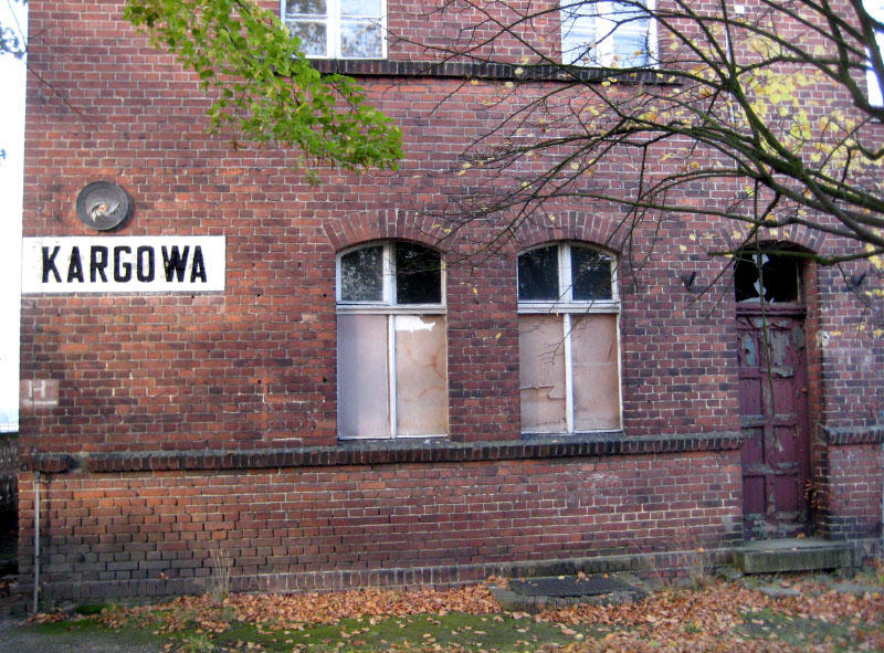 Zamknięta stacja Kargowa. Tablica z nazwą stacji prezentuje się pozytywnie.