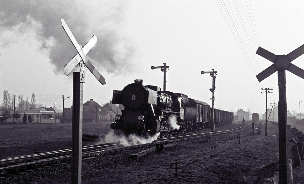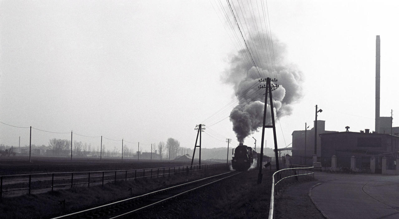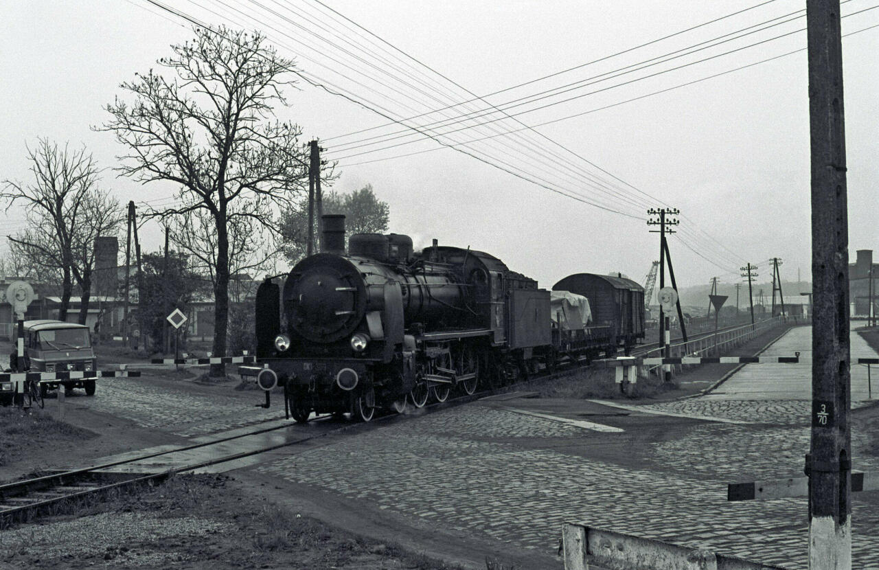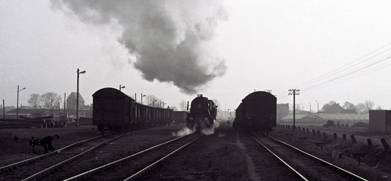 Ol49 z pociągiem do Sulechowa rusza z peronów stacji Kargowa. Jeszcze nic nie zwiastuje nadchodzącej katastrofy. Widok w kierunku północno-wschodnim (wyjazd na Wolsztyn).