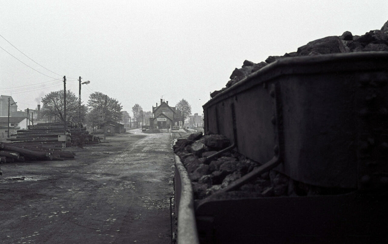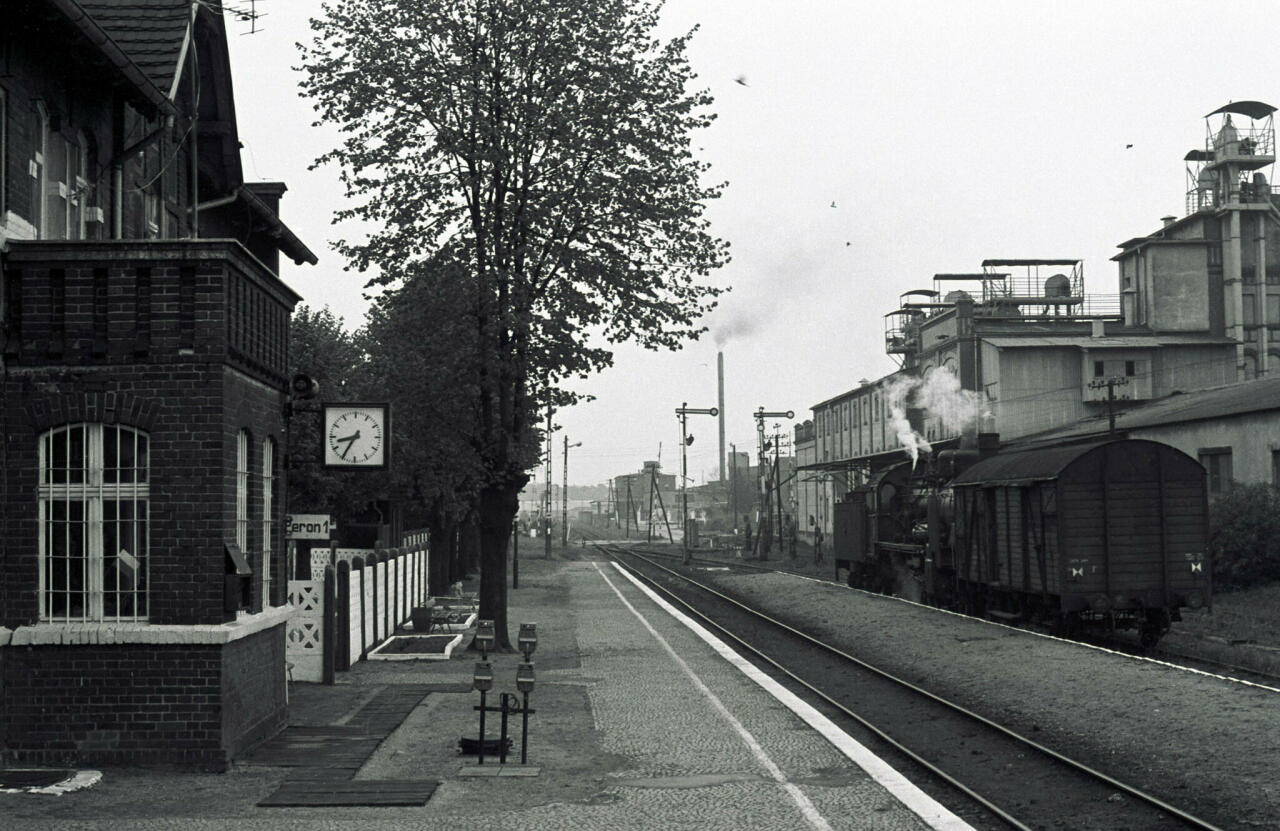 Plac ładunkowy w Kargowej widziany zza węgła tendra Ok1. W tle budynek dworca. Widok w kierunku wschodnim (Wolsztyn).