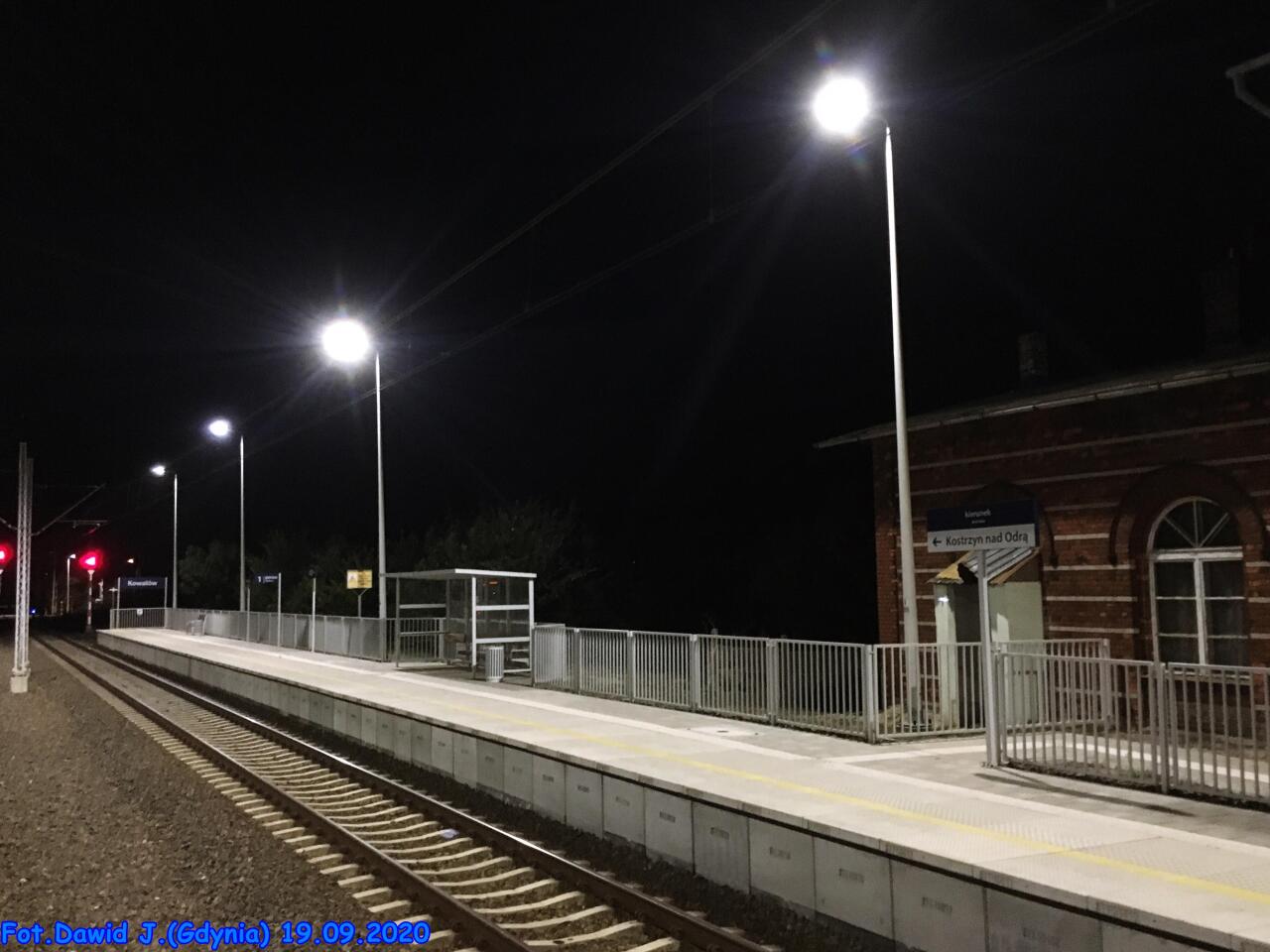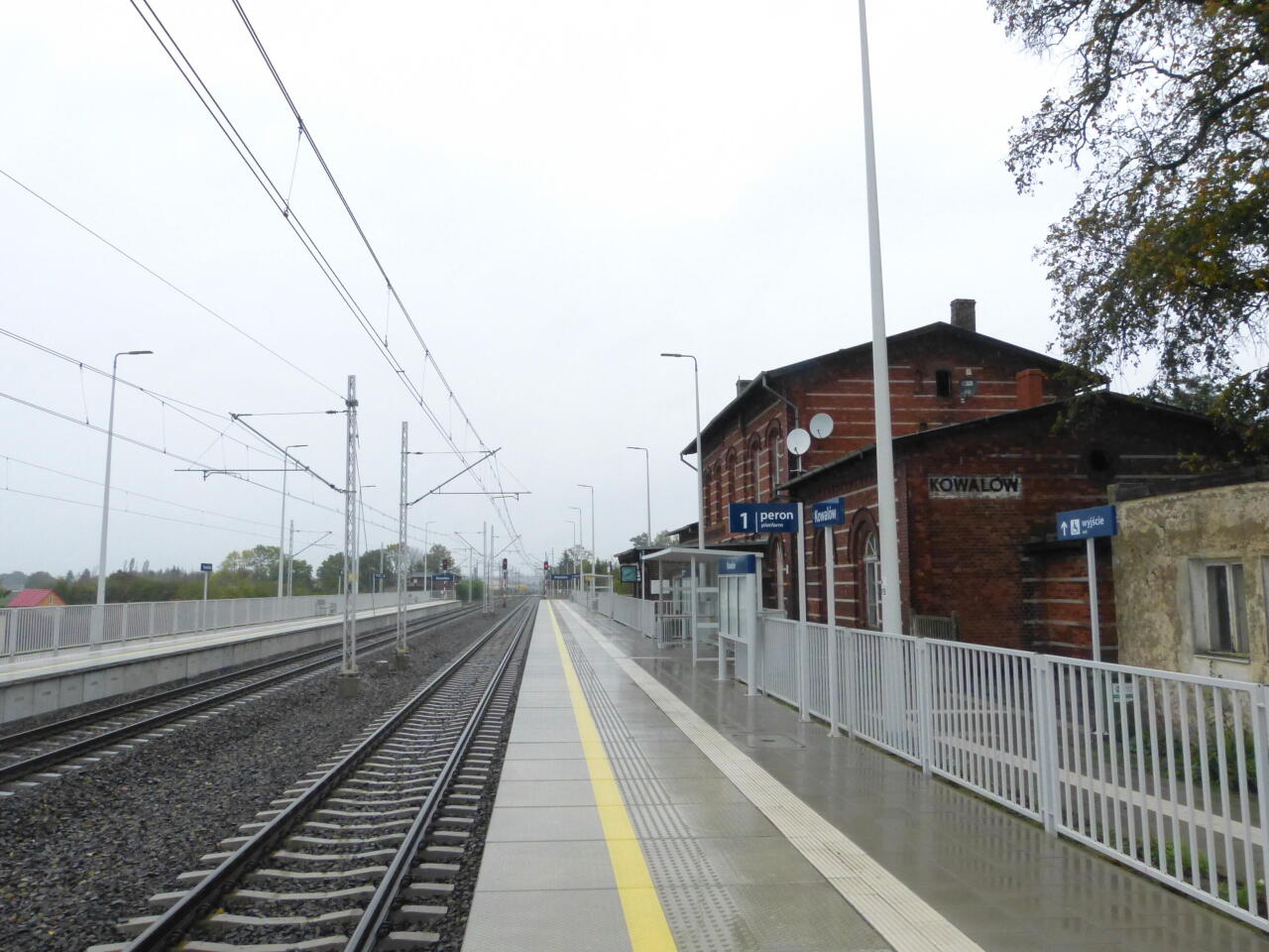 Zmodernizowane perony i płoty w Kowalowie. Z prawej budynek dworca. Widok w kierunku Kostrzyna.