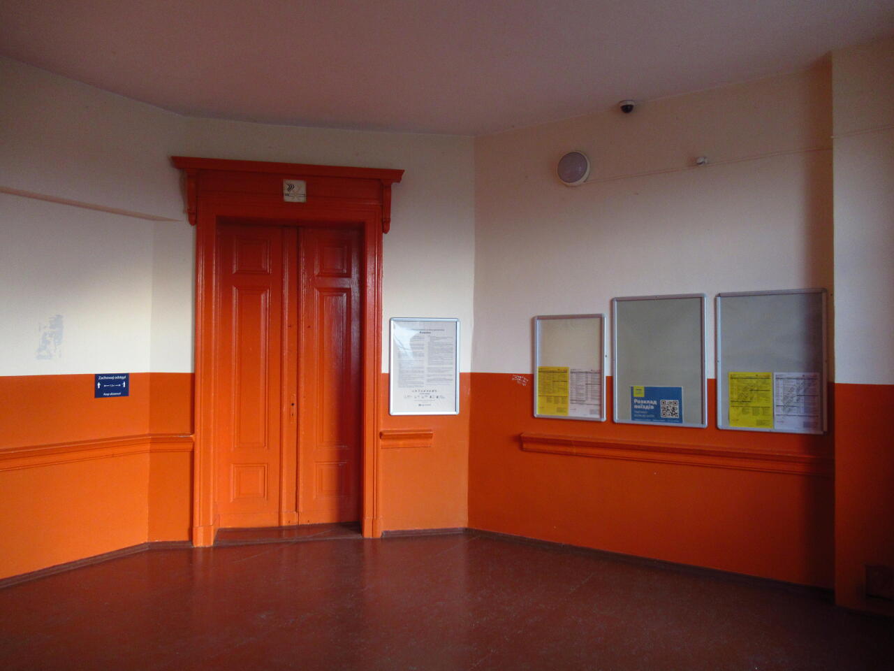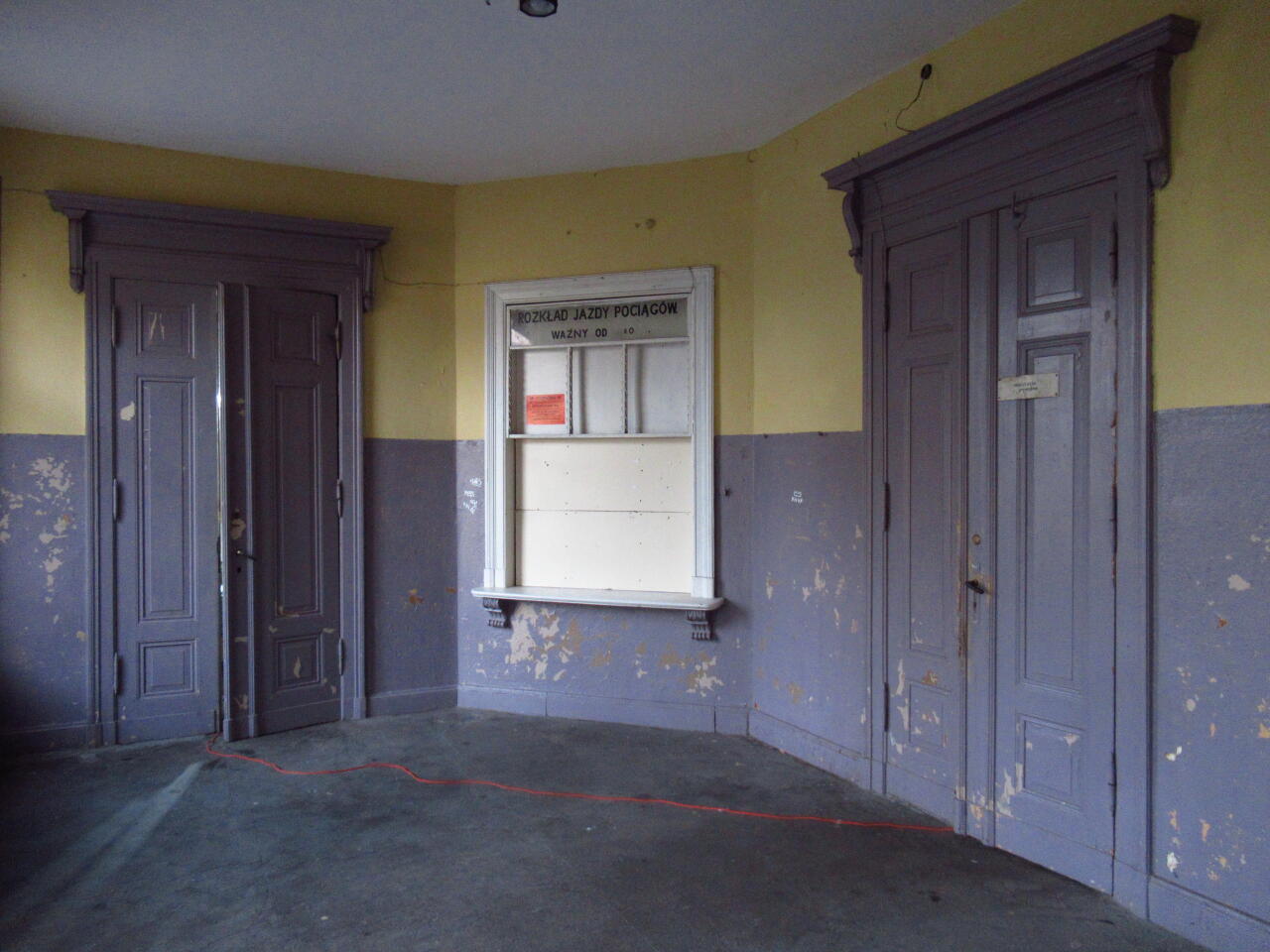 Wnętrze dworca, a raczej czegoś na kształt antryju. Na wprost do poczekalni, czynnej, ale dostęp ino od strony peronu.