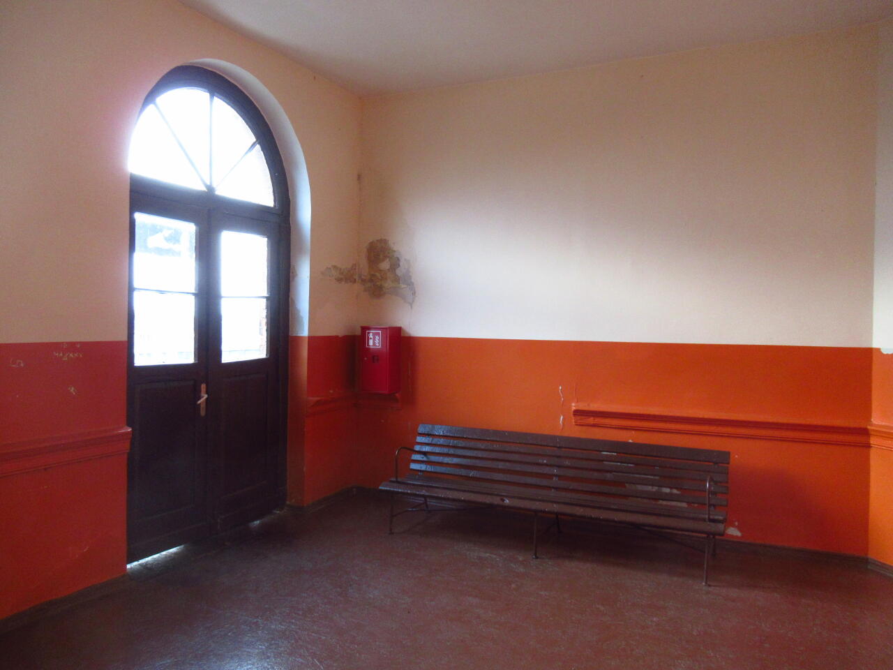 Poczekalnia, czynna, dostępna ino od strony peronu. Przejście do dalszej części dworca i wyjście do miasta (drzwiami na wprost) - zawarte.
