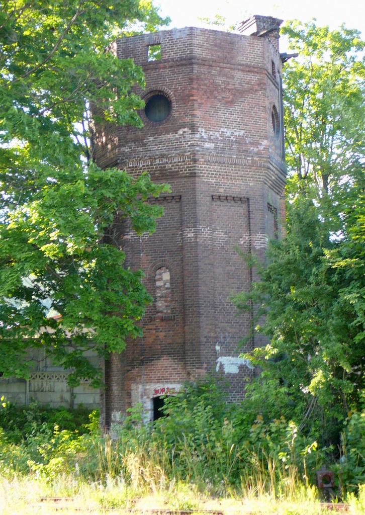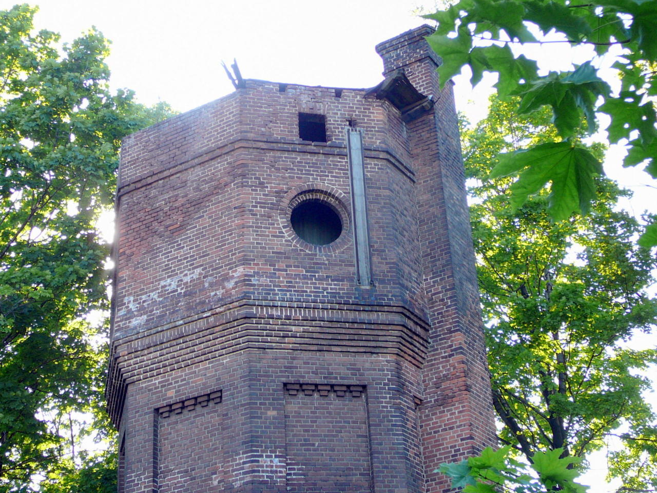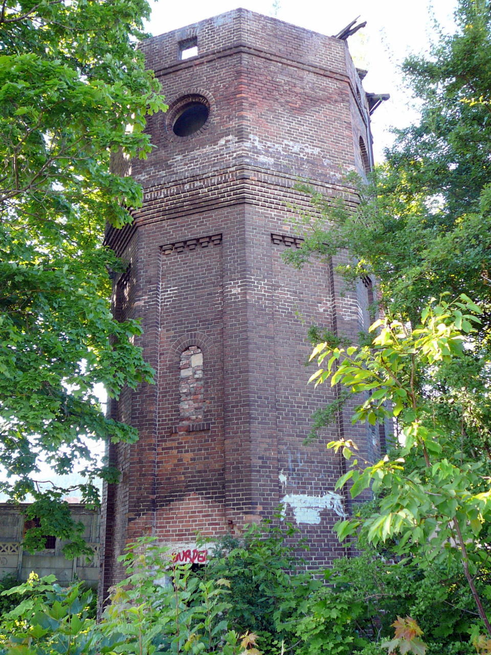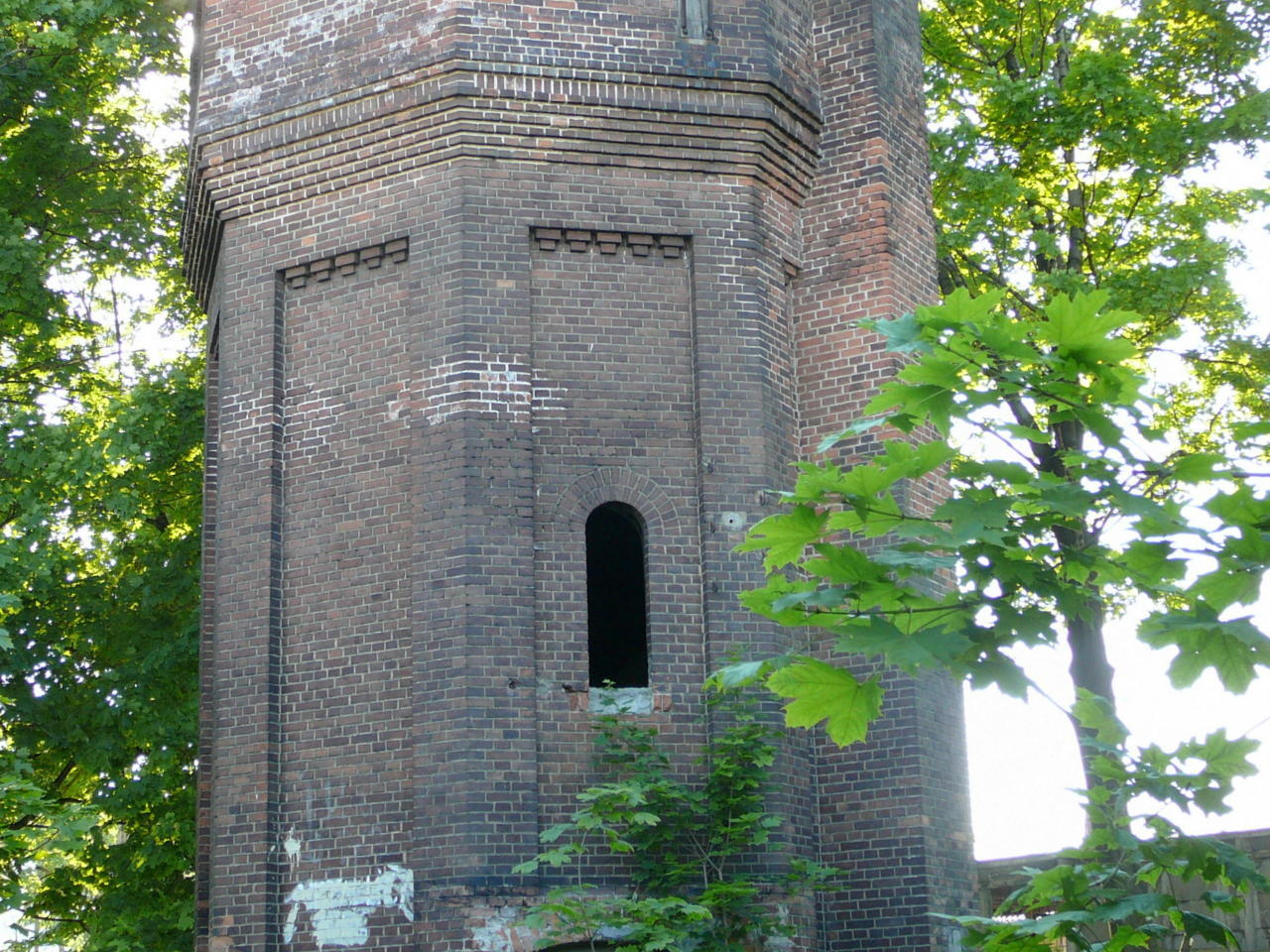 Piechowice. Górna część wieży wodnej, w okrągłym okienku zbiornik wody.