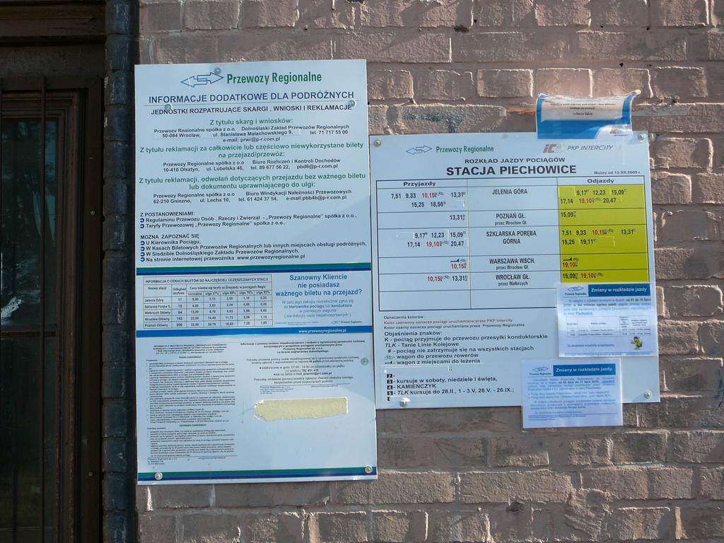 Piechowice. Informacje na murze dworca i aktualny rozkład jazdy.