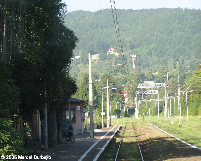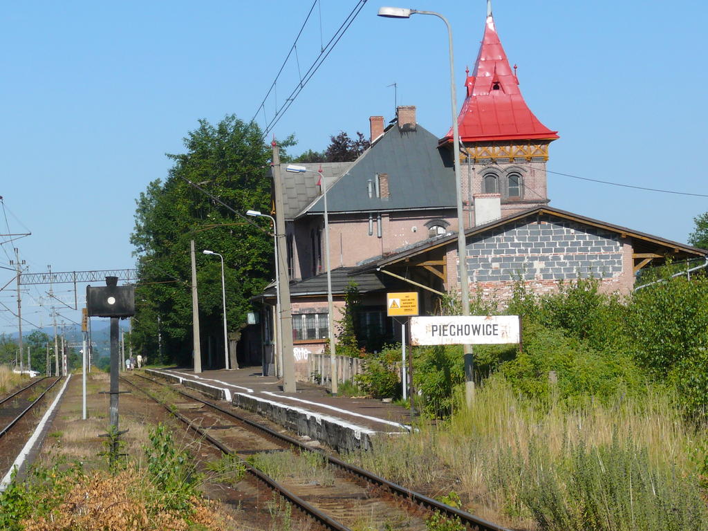 Widok ogólny na stację w Piechowicach; w lewo Jelenia Góra, w prawo Szklarska Poręba. W centrum kadru budynek dworca z przybudówką mieszczącą nastawnię dysponującą.