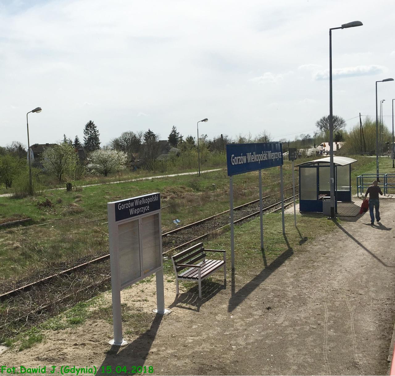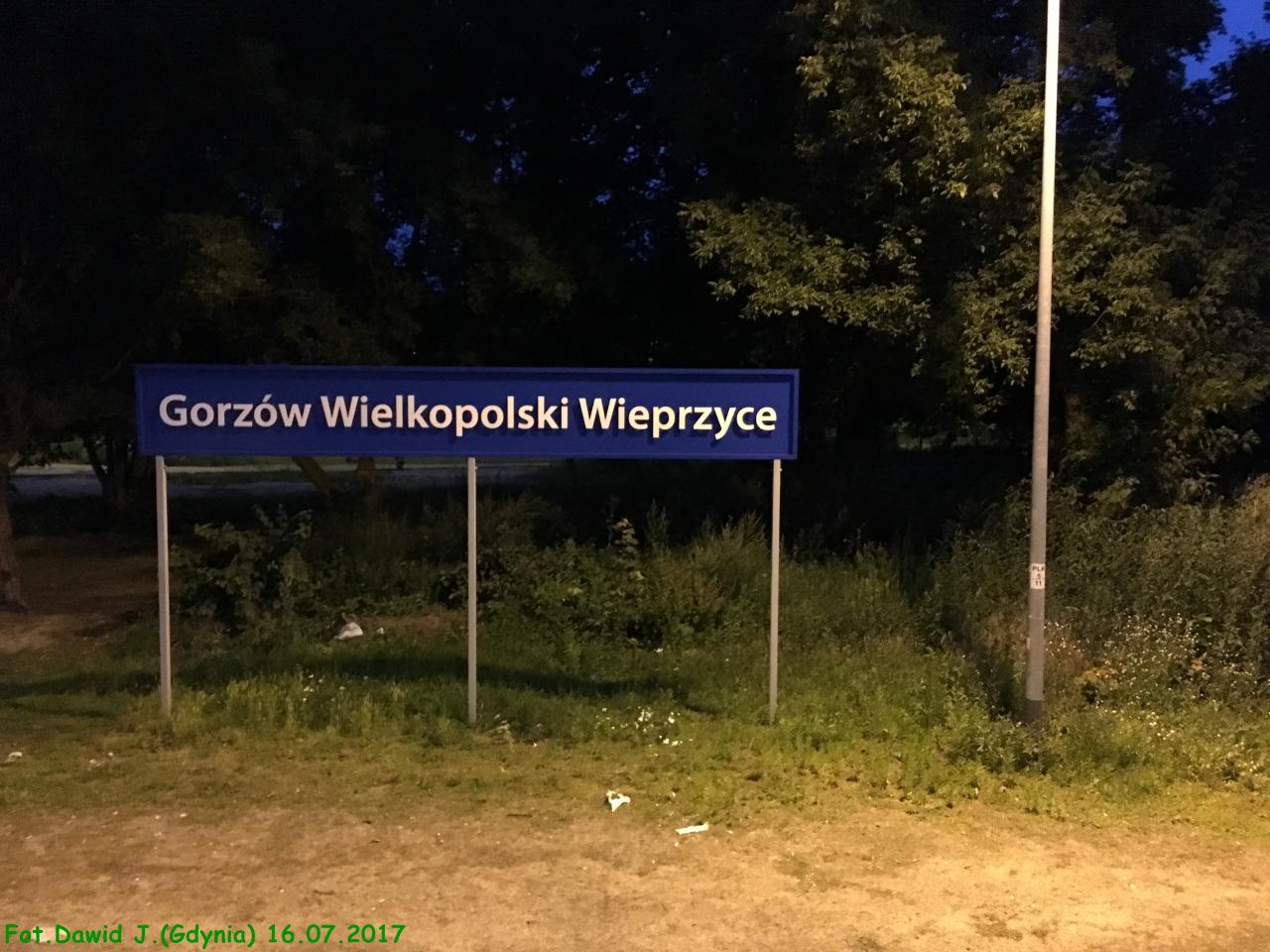 Gorzów Wielkopolski Wieprzyce. Peron z tablicą z nazwą stacji. W lewo Kostrzyn i Myślibórz, w prawo stacja Gorzów Wielkopolski.