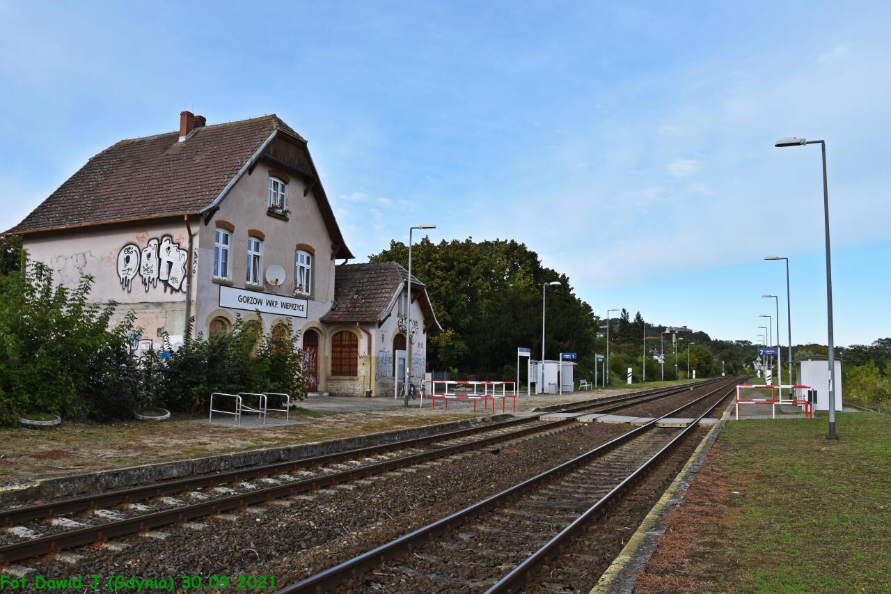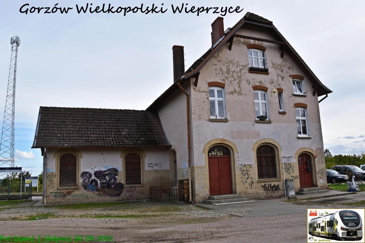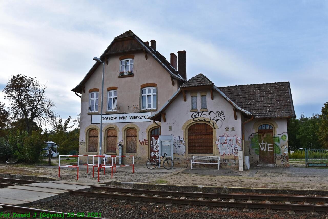 Przystanek PKP Gorzów Wieprzyce. Budynek dworcowy od strony peronu, z którego odjeżdżają pociągi w kierunku Kostrzyna. Wjazd od strony stacji Gorzów Wielkopolski.