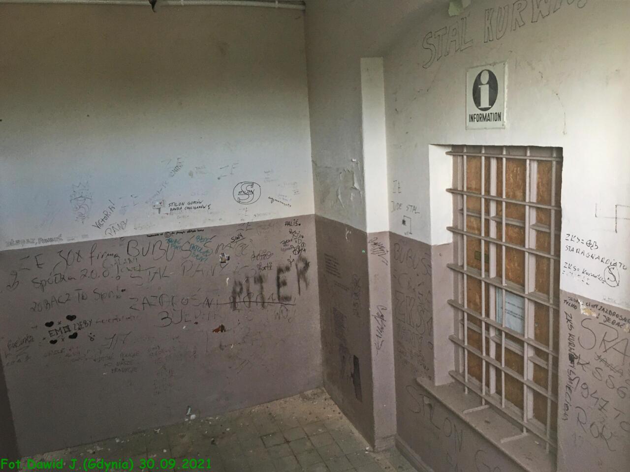 Wnętrze budynku dworcowego. Nieczynna poczekalnia dla podróżnych. Nieczynne okienko kasy biletowej znajduje się po prawej stronie.