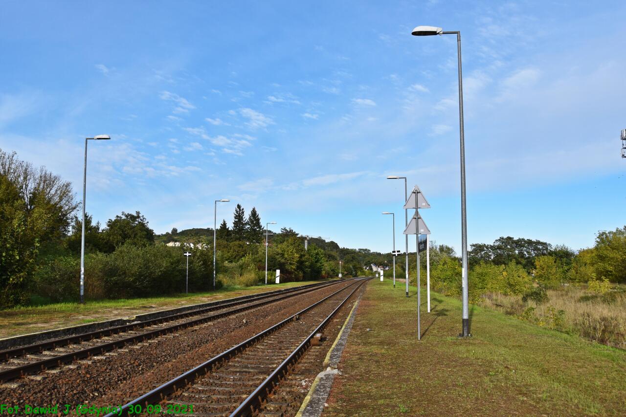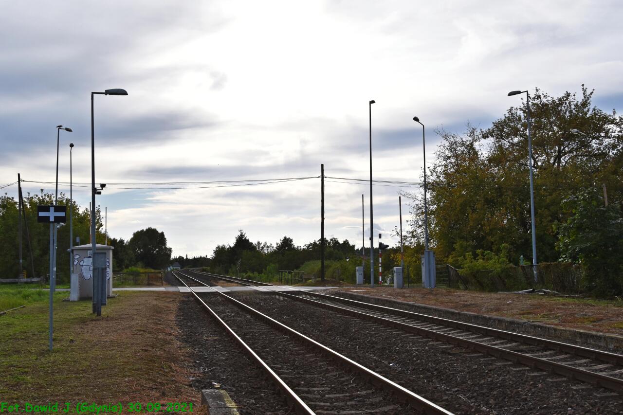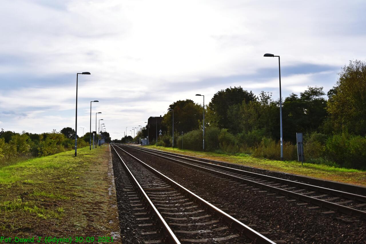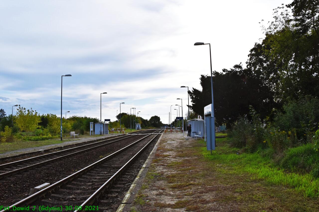 Widok z peronu 2 w kierunku Kostrzyna i Myśliborza. Na peronie 2 znajdują się: tablica informacyjna z nazwą przystanku osobowego, ławka, tablica z nazwą przystanku osobowego i wiata dla podróżnych.