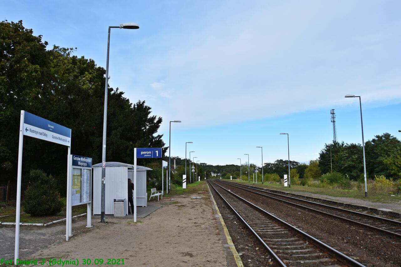 Budynek dworcowy widoczny od strony torów. Widok na peron 1 na którym znajdują się m.in: tablica informacyjna, tablica informacyjna z nazwą przystanku osobowego, tablica z kierunkami i wiata dla podróżnych. W lewo Kostrzyn i Myślibórz, w prawo stacja Gorzów Wielkopolski/Tczew.