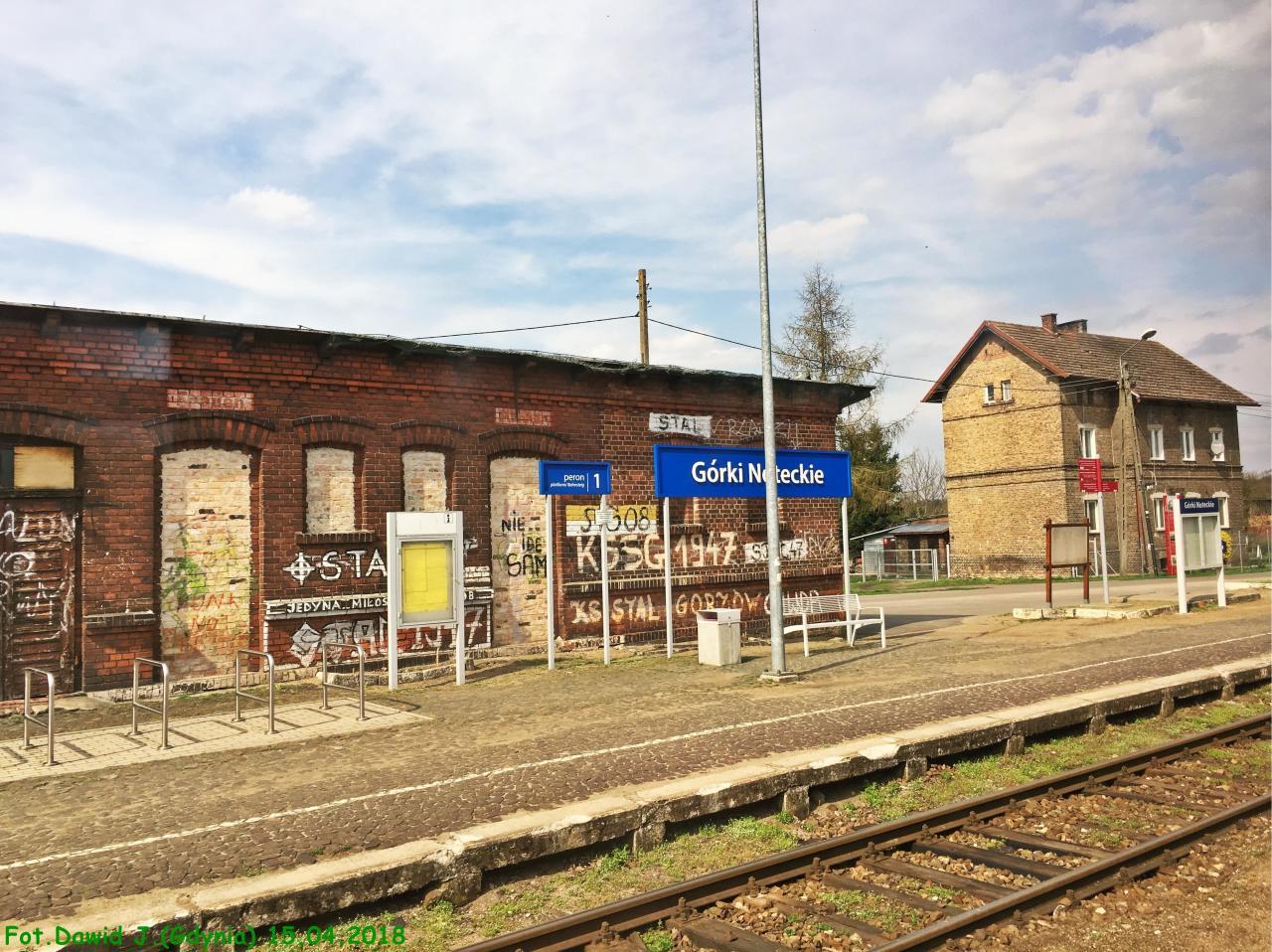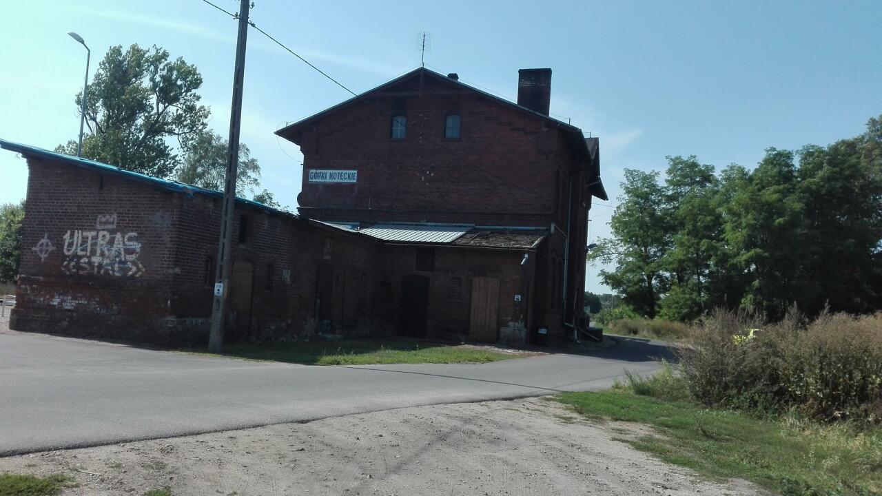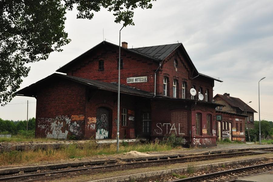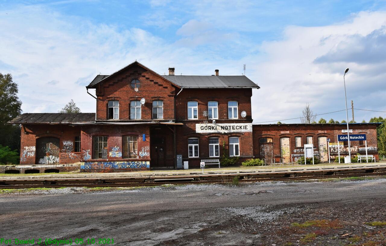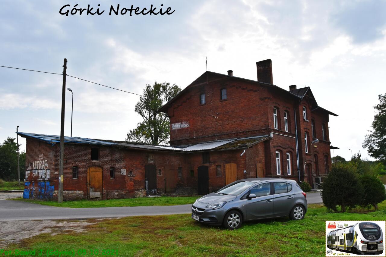 Zaniedbany budynek dworca w Górkach Noteckich. Na parterze, w przybudówce mieściła się nastawnia dysponująca. Z lewej magazyn towarowy z rampą. Widok od strony peronów i wjazdu z Gorzowa Wielkopolskiego.