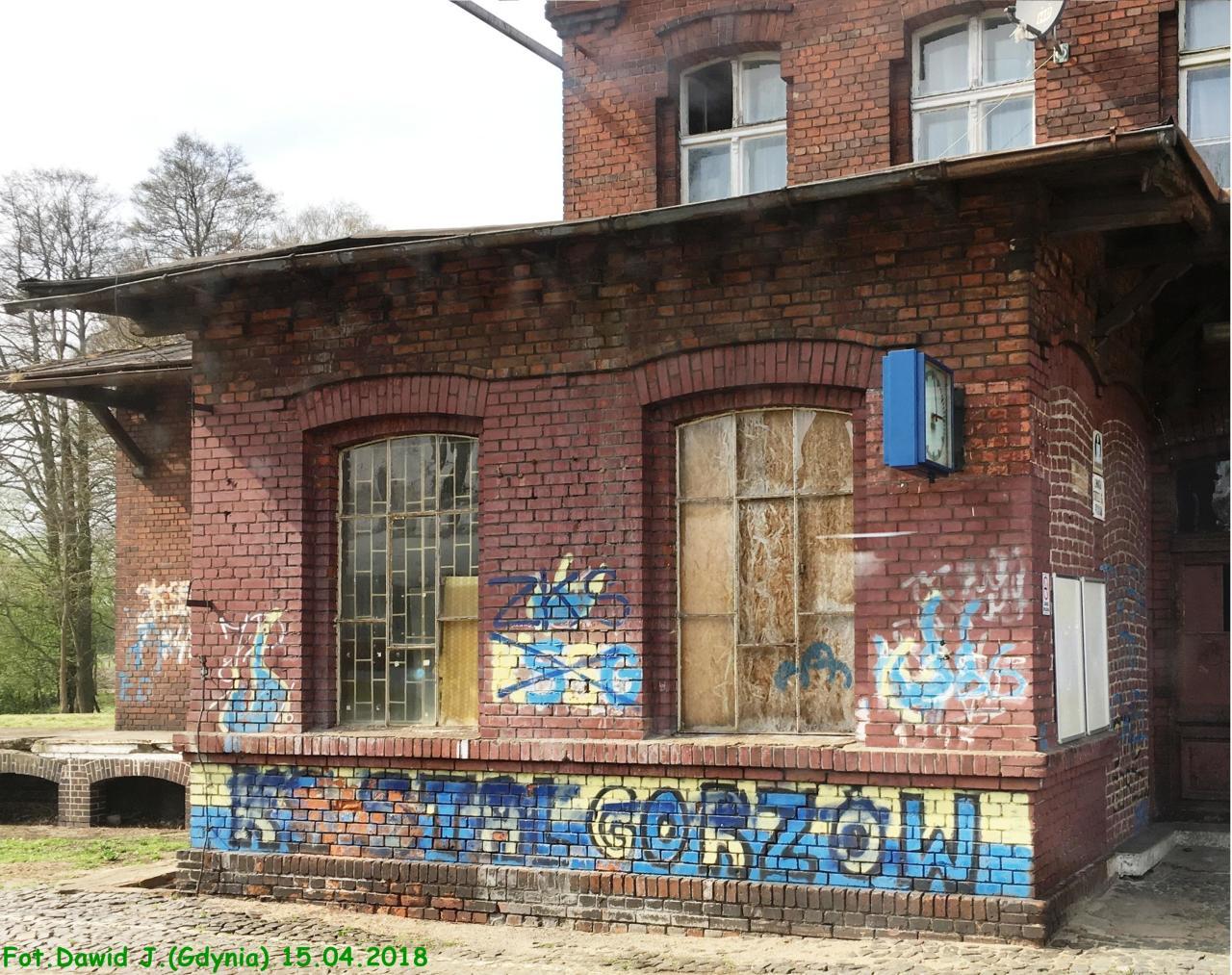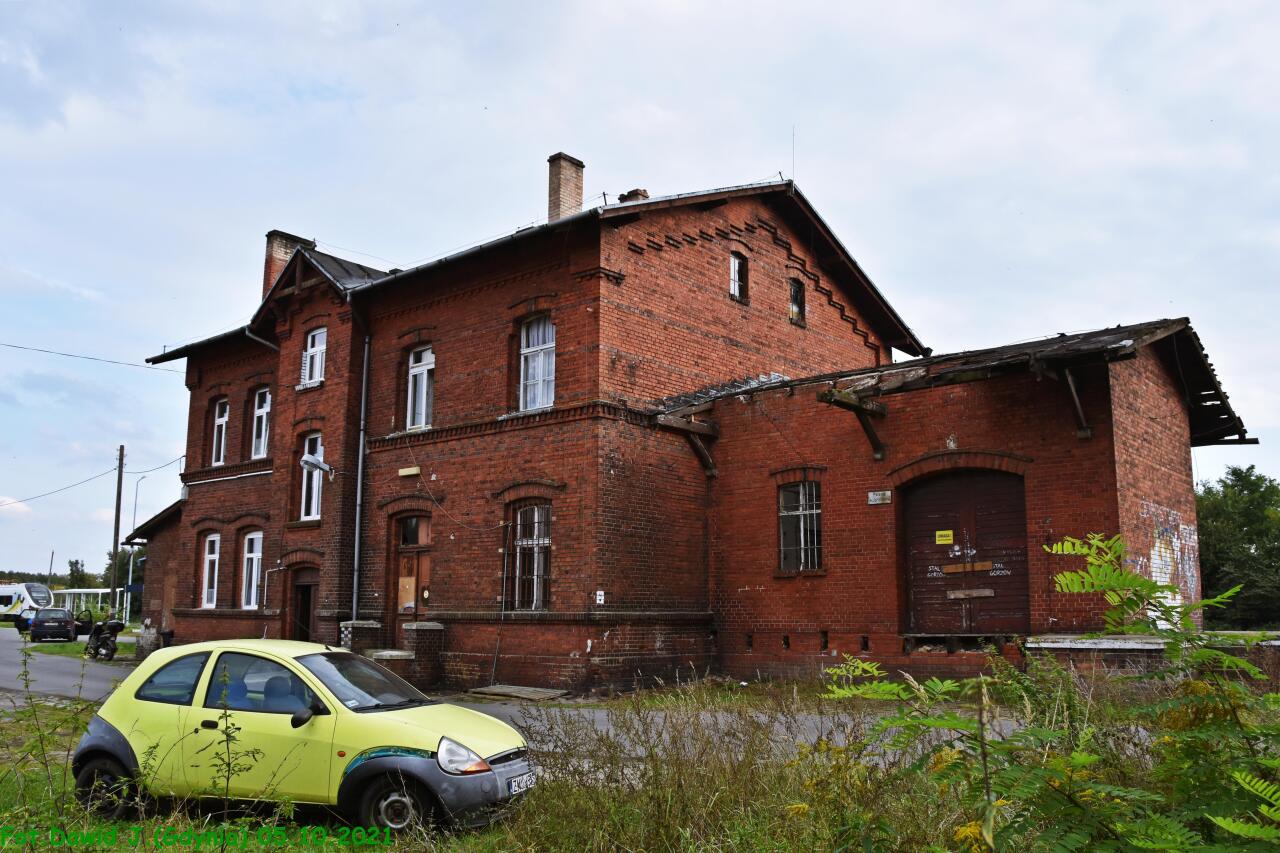 Magazyn towarowy z rampą i budynek dworcowy widoczny od strony peronów i wjazdu z Gorzowa Wielkopolskiego. Na parterze, w przybudówce mieściła się nastawnia dysponująca.