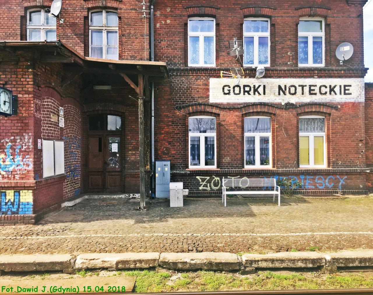Pociąg osobowy z Krzyża do Kostrzyna stoi przy peronie stacji Górki Noteckie. Na samym tyle składu znajduje się najprawdopodobniej kryty wagon towarowy. Z lewej magazyn towarowy i dworzec. Na parterze, w przybudówce mieściła się nastawnia dysponująca. Widok w kierunku wschodnim (Strzelce Krajeńskie Wschód/Krzyż).