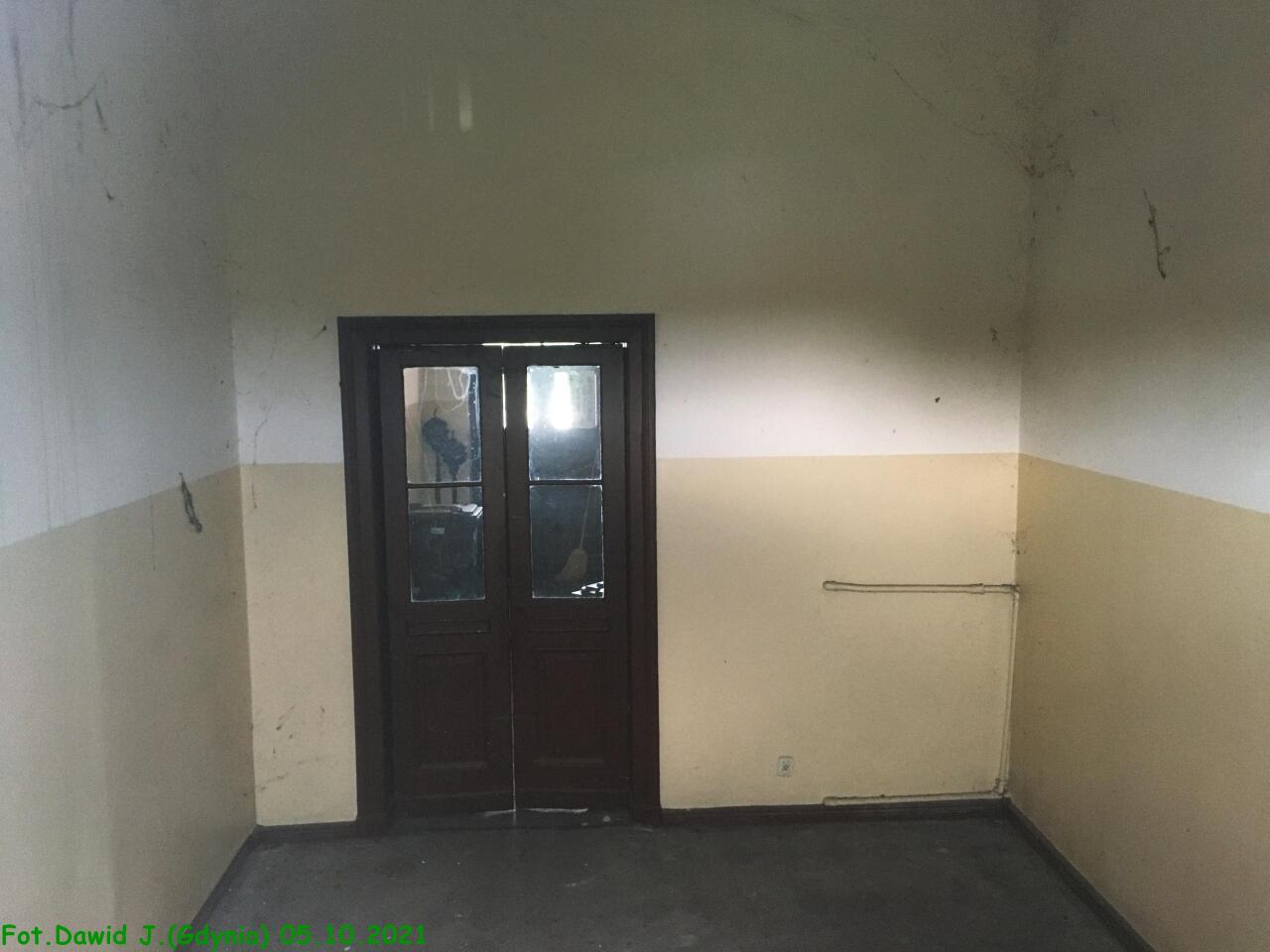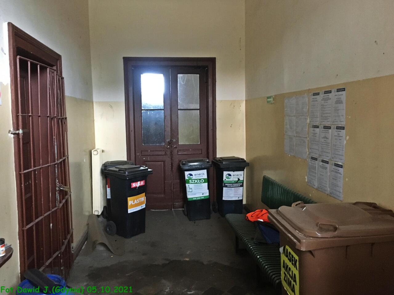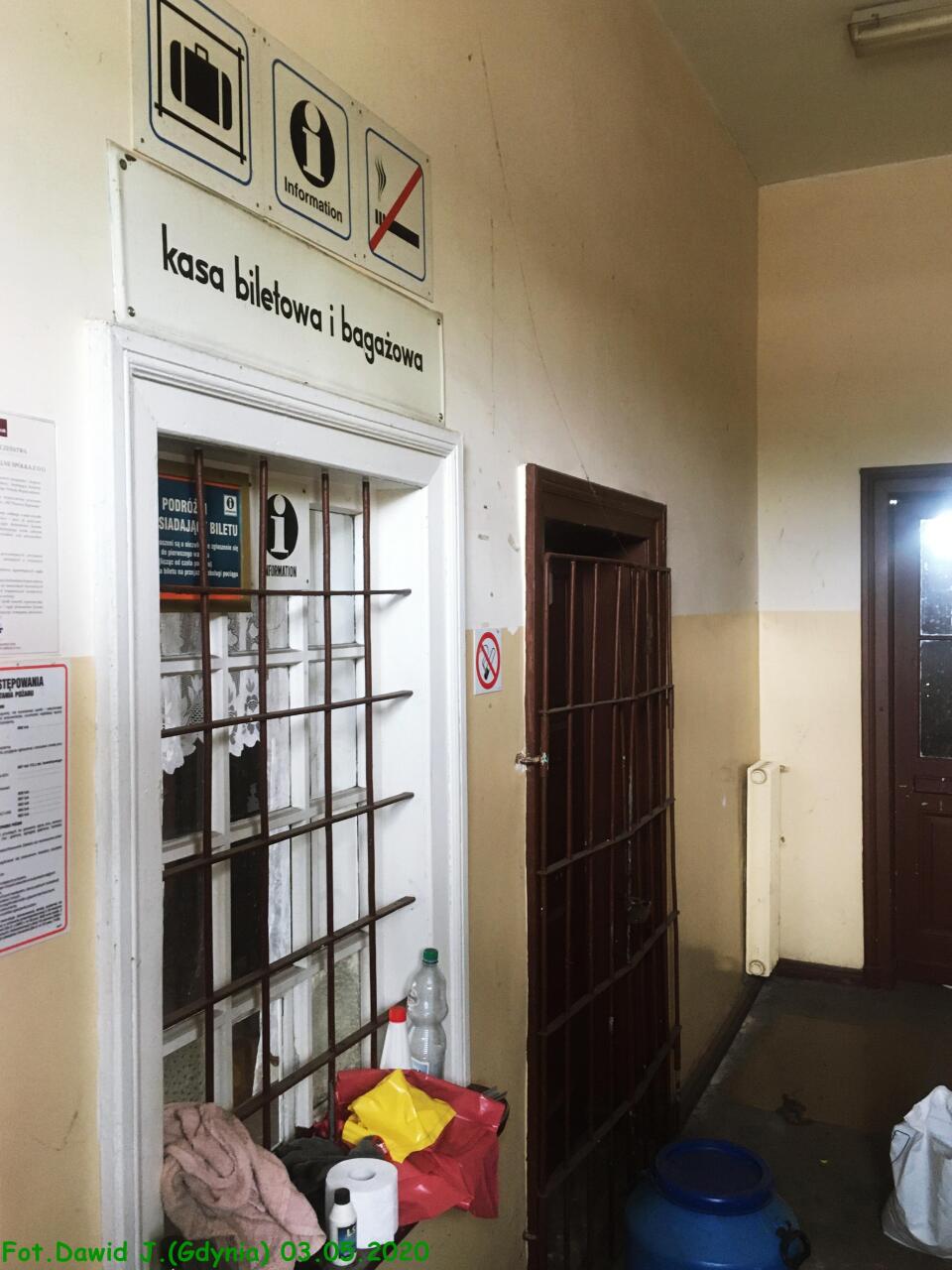 Wnętrze budynku dworcowego. Nieczynna poczekalnia dla podróżnych. Nieczynne okienko kasy biletowej.