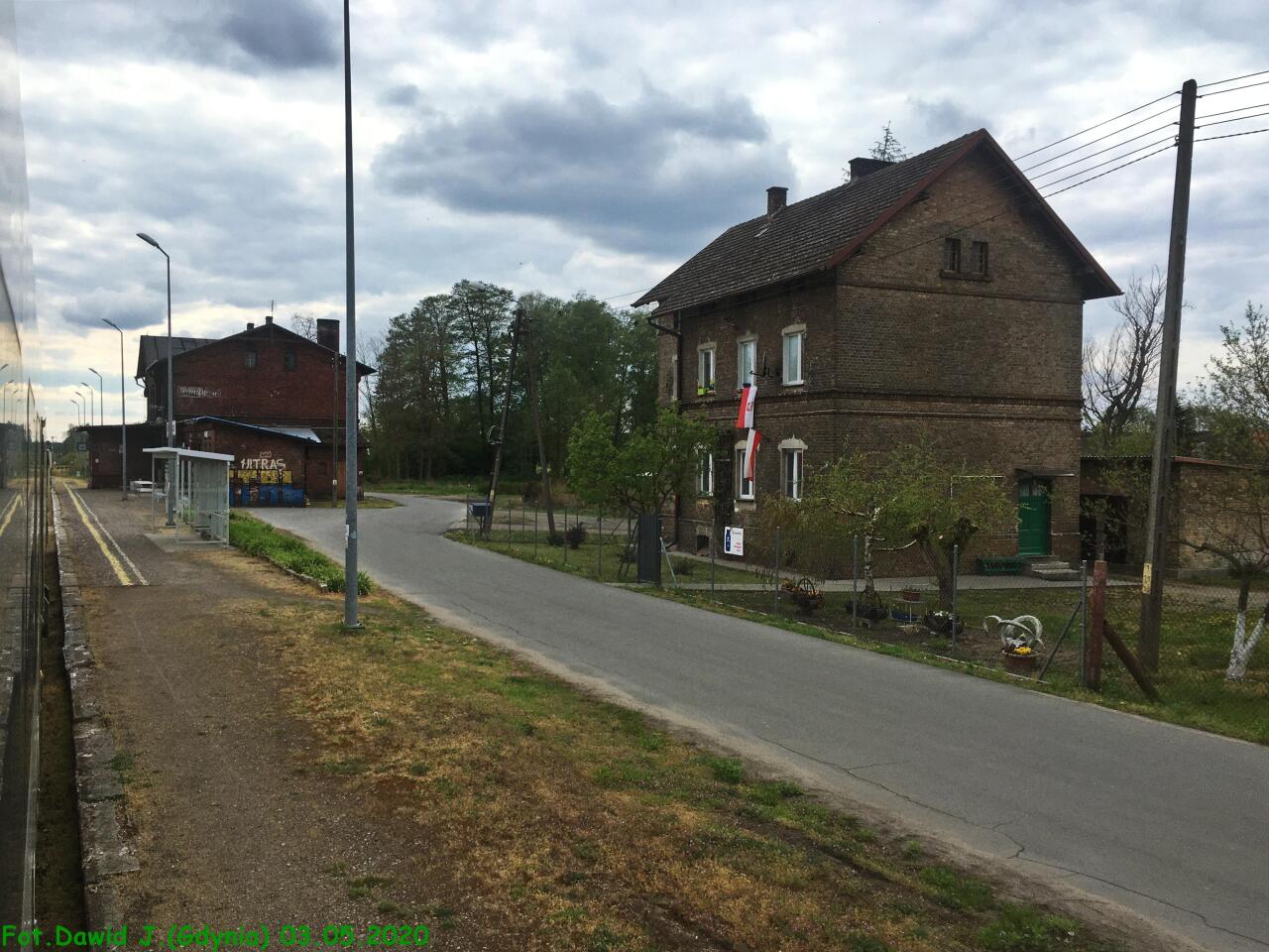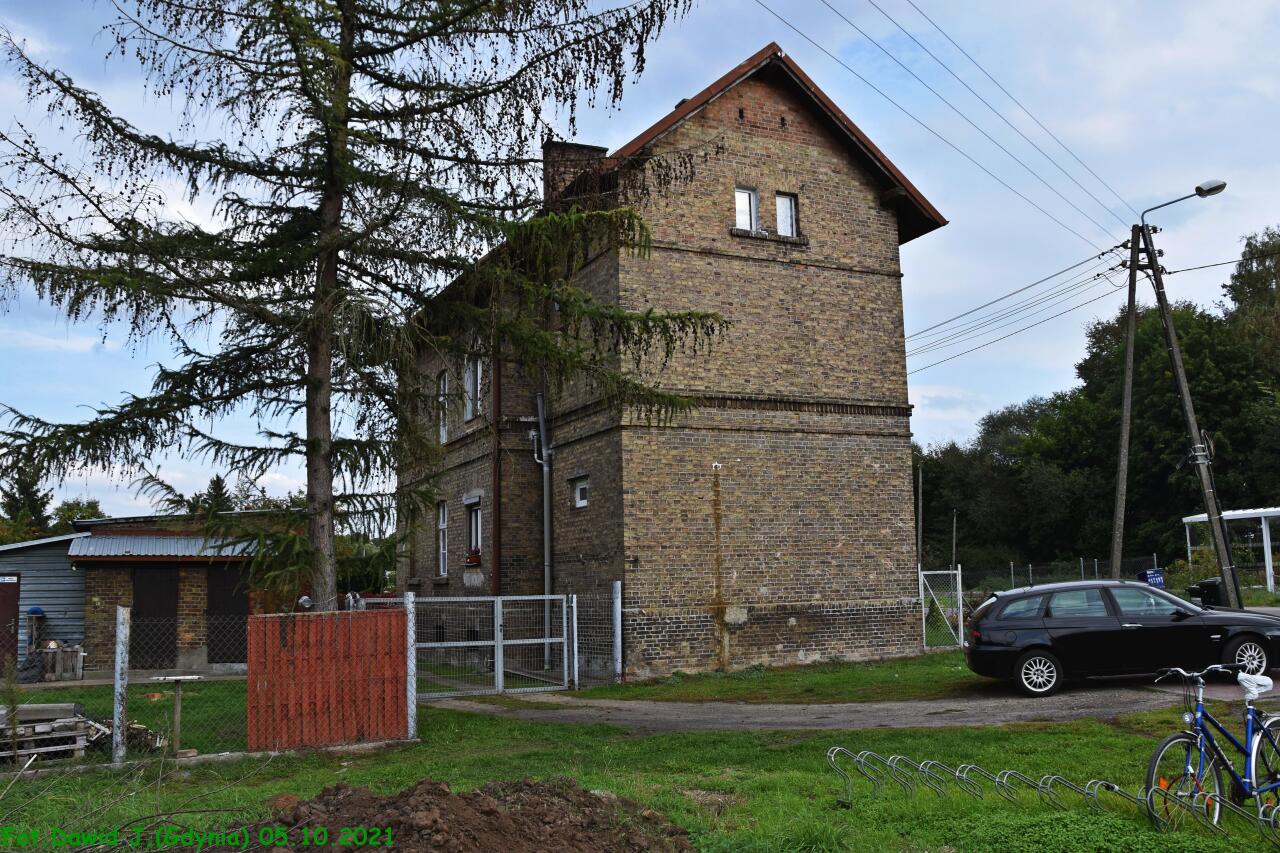 Kolejowy budynek mieszkalny widoczny od strony torów. W lewo Gorzów Wielkopolski/Kostrzyn, w prawo Strzelce Krajeńskie Wschód/Krzyż.