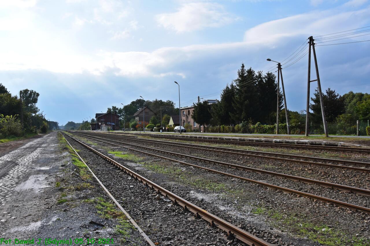 Widok z peronu 1 w kierunku Gorzowa Wielkopolskiego/Kostrzyna. Budynek dworcowy i kolejowy budynek mieszkalny znajdują się po prawej stronie.