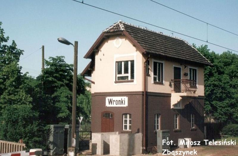 Nastawnia wykonawcza we Wronkach, od strony wjazdu z Krzyża i przejeździe kolejowym przez ul. Poznańską. 22.05.1992.