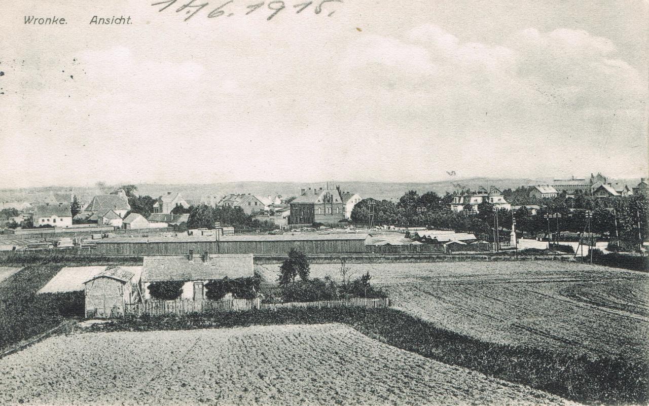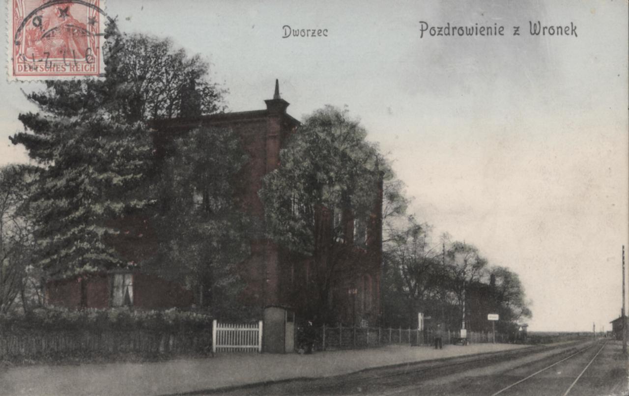 Pierwszy dworzec we Wronkach. Stał bliżej przejazdu z ul.Poznańską. Przed dworcem stoi parowóz Pruski serii P3 (na PKP nosił oznaczenie Oc1). Widać też lampę zwrotnikową na wysokim słupku. Skan z pocztówki, data stempla 1908 rok.