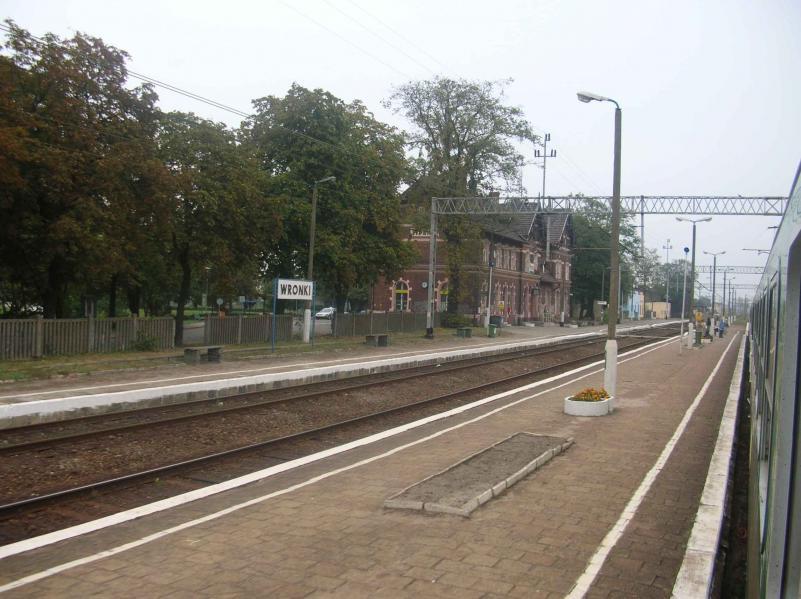Wronki. Widok ogólny peronów i budynków od strony północno-zachodniej (z pociągu do Poznania).
