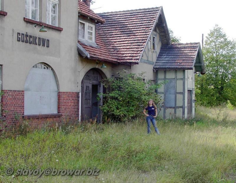 Pozostałości stacji w Gościkowie. W tle budynek dworca. Widok od strony Staropola/Toporowa.
