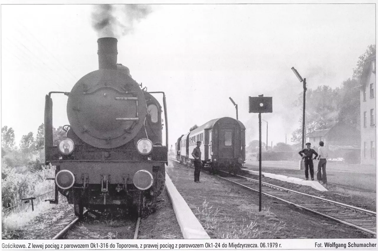 Około kilometra od budynku dworca w Gościkowie. W dolnym lewym, rogu znajduje się fundament dawnego semafora wjazdowego od strony Staropola/Toporowa i, po prawej stronie, za nasypem mały, dziwny budynek. Czy był on bezpośrednio związany z infrastrukturą kolejową, a jeśli tak, jaką pełnił funkcję - pozostaje zagadką…