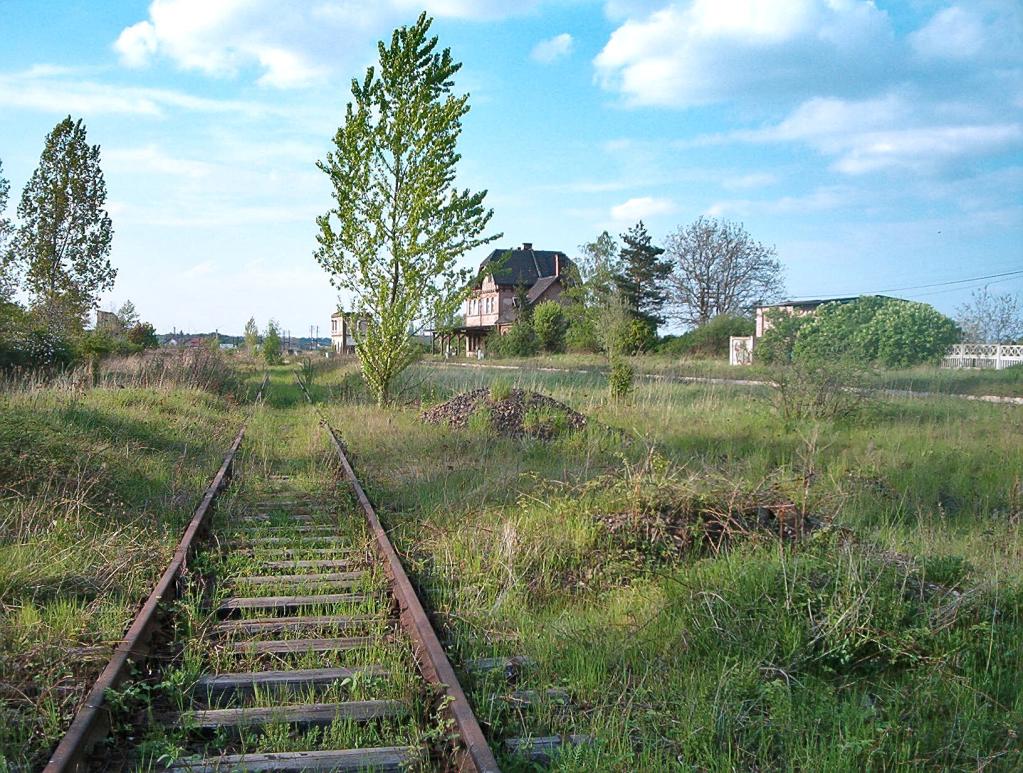 Zdekompletowane torowisko dawnej stacji na wysokości peronów. Z lewej fragment dworca. Widok w kierunku południowym: Dzierżoniów Śląski, Jugowice/Jedlina-Zdrój.