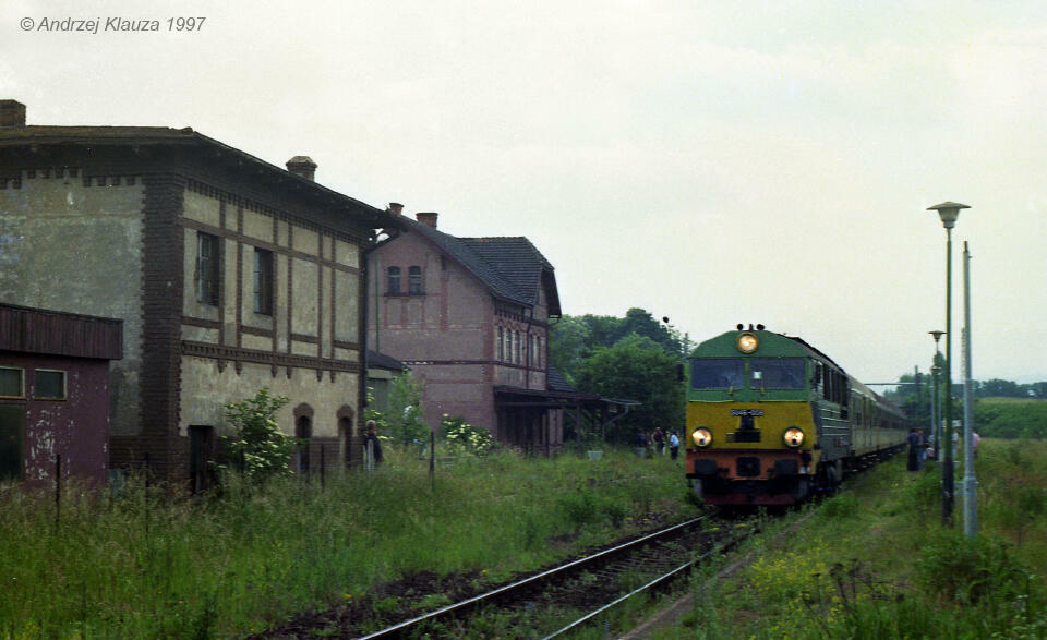 Czas na dzisiejszą truskawkę na torcie. Zdjęcie przedstawia zamkniętą już wtedy stację Świdnica Kraszowice, jednak z wciąż istniejącą infrastrukturą kolejową pamiętającą czasy czterokierunkowego węzła. Dworzec, wtedy jeszcze z zamieszkałym piętrem i drewnianą wiatą to ostatni z budynków w kadrze, którzy choć zdewastowany, przetrwał do dziś. Przy peronie 2, który obsługiwał także pociągi do Jedliny Zdroju, zatrzymał się typowy dla tamtego okresu skład zestawiony z Suczki i kilku wagonów - biorąc pod uwagę obecność wagonu klasy 1 i bagażowego, jechał on jako osobowy Legnica - Katowice, bądź pośpieszny Jelenia Góra - Kraków Główny. Widok w kierunku północnym (Świdnica Miasto, Świdnica Przedmieście). Tym zdjęciem serdecznie witamy pana Rafała Matuszewskiego na Bazie Kolejowej i dziękujemy za wyrażenie zgody na udostępnienie tu swoich unikatowych kadrów!