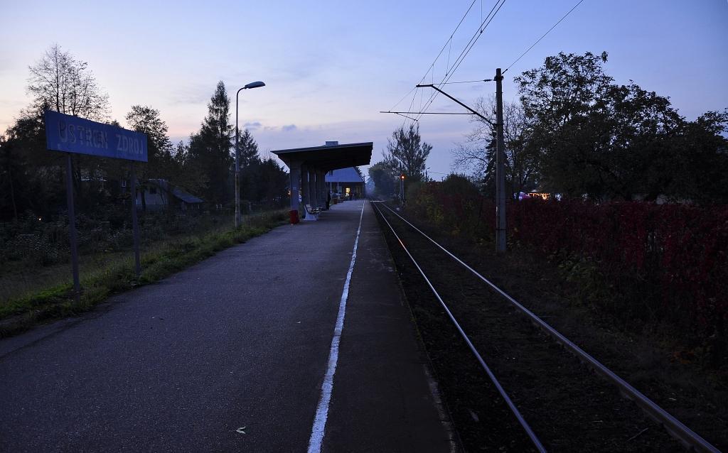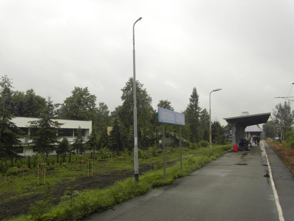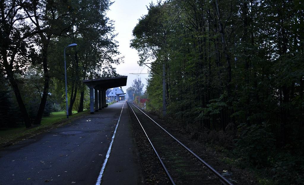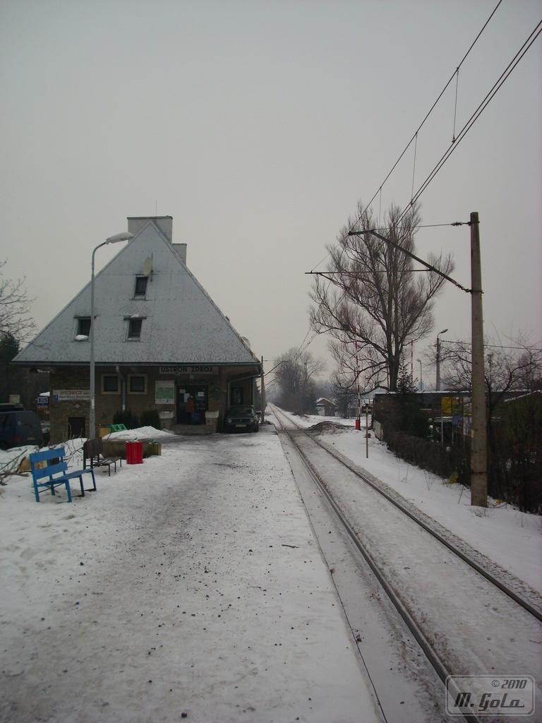 Tablica Ustroń Zdrój i wiata peronowa, widok w kierunku Ustronia Centrum i Goleszowa.