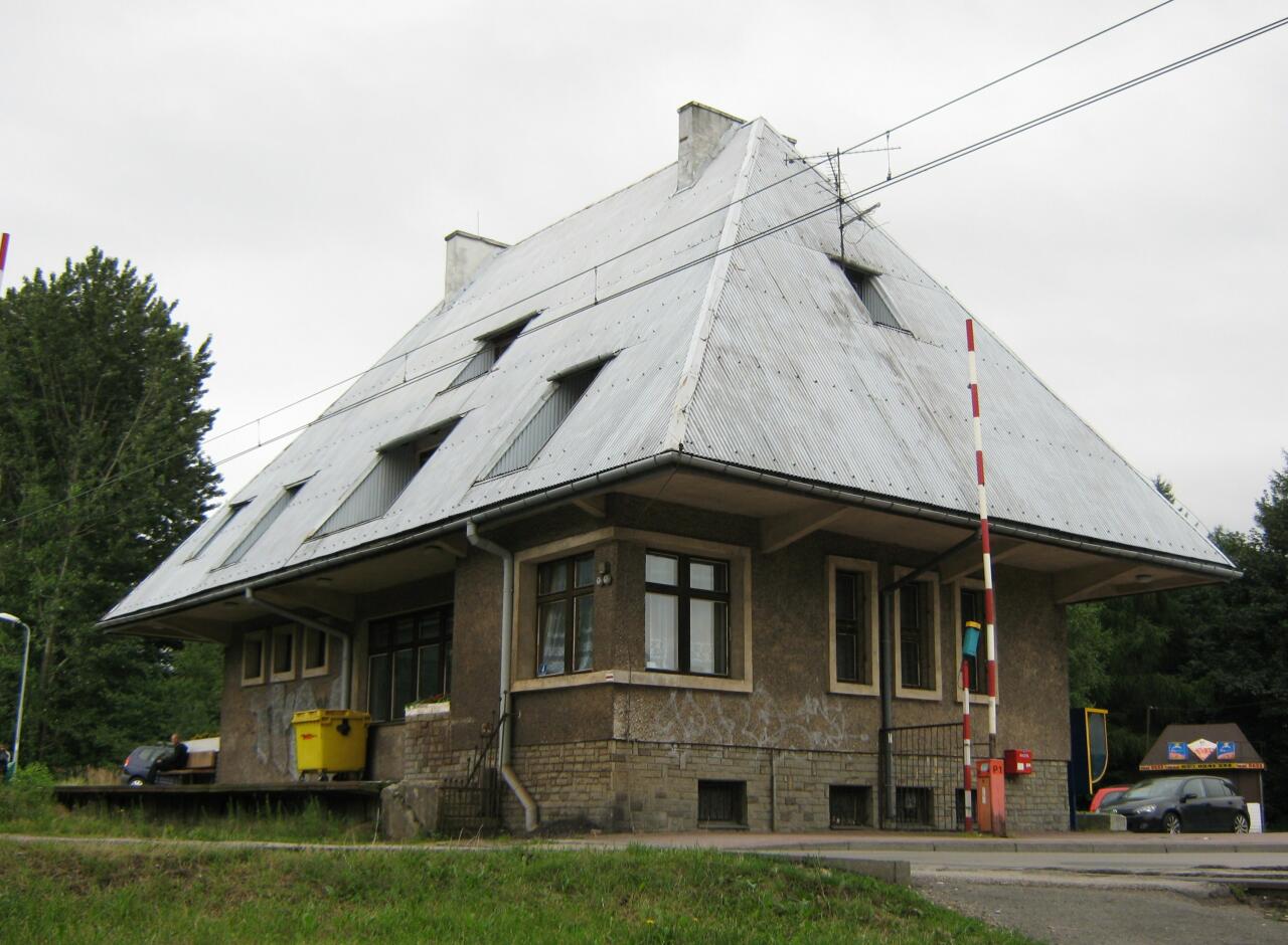 Widok na peron i budynek dworca w kierunku północno-zachodnim (Ustroń/Goleszów).