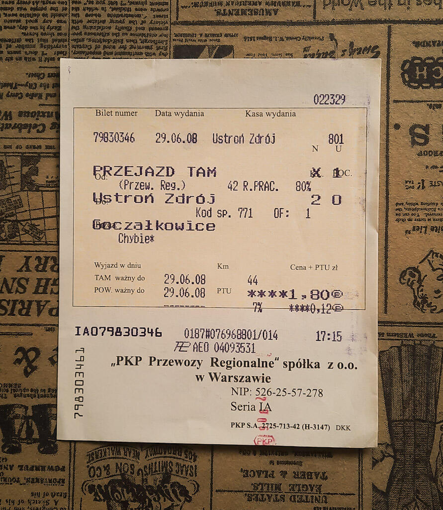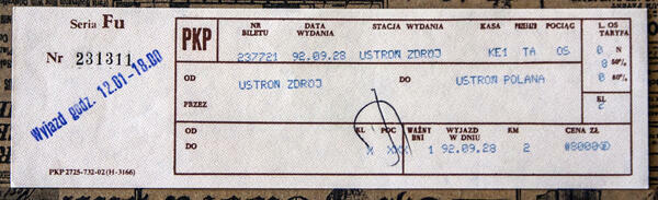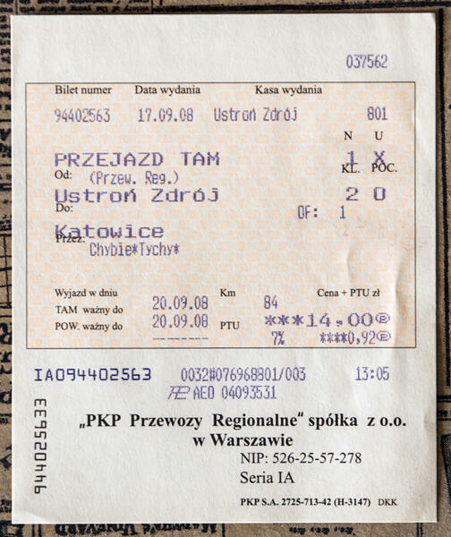 Bilet wydany w zlikwidowanej kasie na przystanku Ustroń Zdrój.