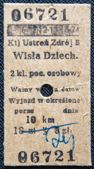 Bilet kartonikowy wydany na stacji Ustroń Zdrój.
