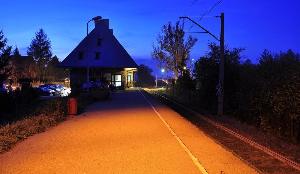 Peron stacji nocą-widok w kierunku Ustronia Polany.