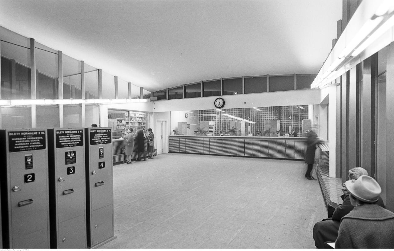 "Wnętrze budynku stacji. Widoczne stanowiska kasowe oraz automaty do sprzedaży biletów kolejowych".