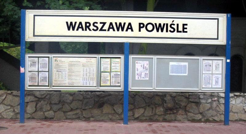 Warszawa Powiśle PKP. Na każdym peronie jest tablica przystanku. Poniżej tablicy pełna i bogata oferta przewozowa Kolei Mazowieckich.