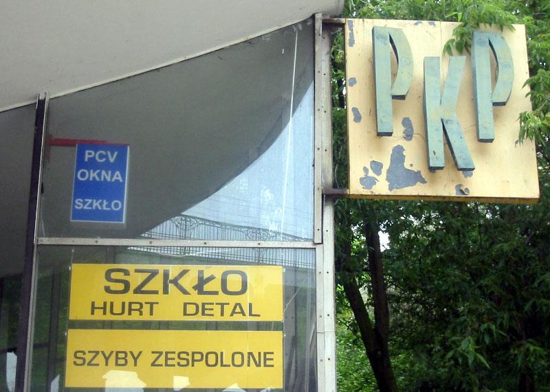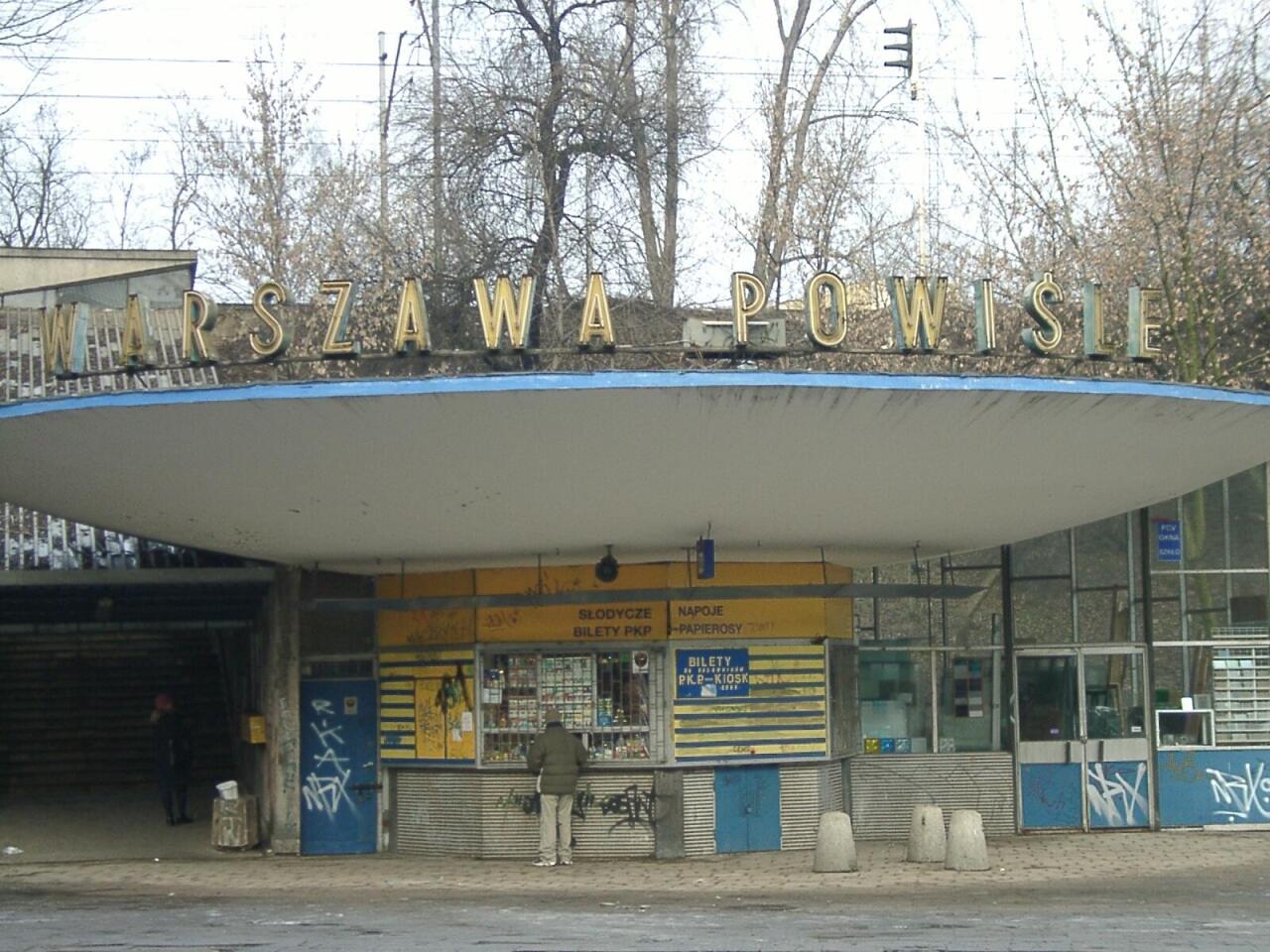 Warszawa Powiśle PKP. Budynek dworcowy od strony ulicy Kruczkowskiego wykorzystano na inne cele. Obok skrótu PKP prezentują się inni użytkownicy.