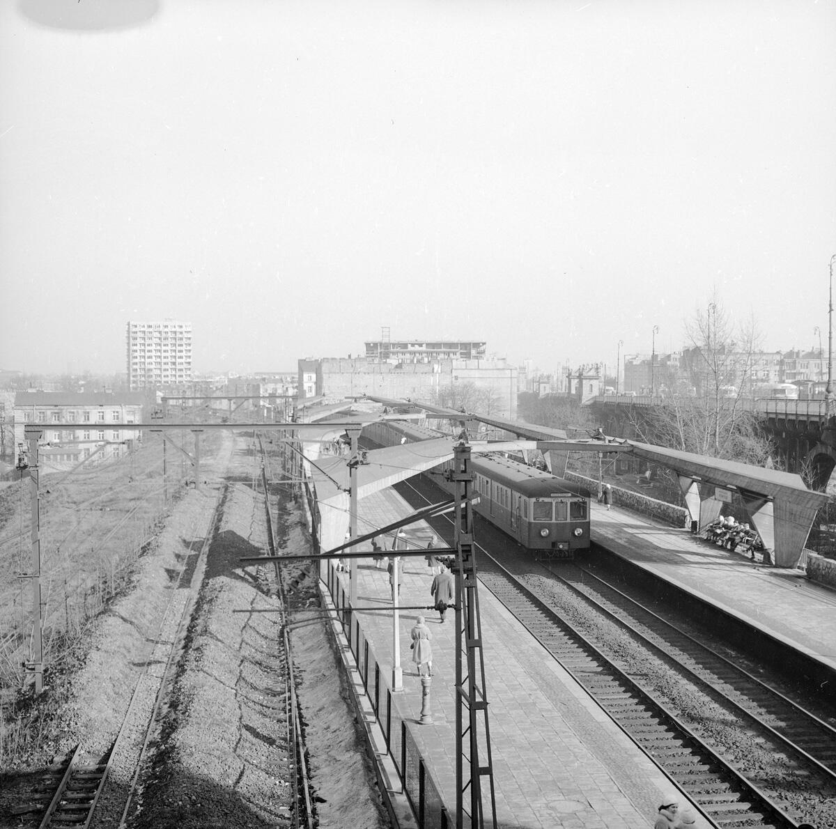 Widok ogólny peronów przystanku Warszawa Powiśle i odjeżdżającego składu EZT EW-55.
