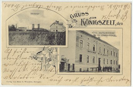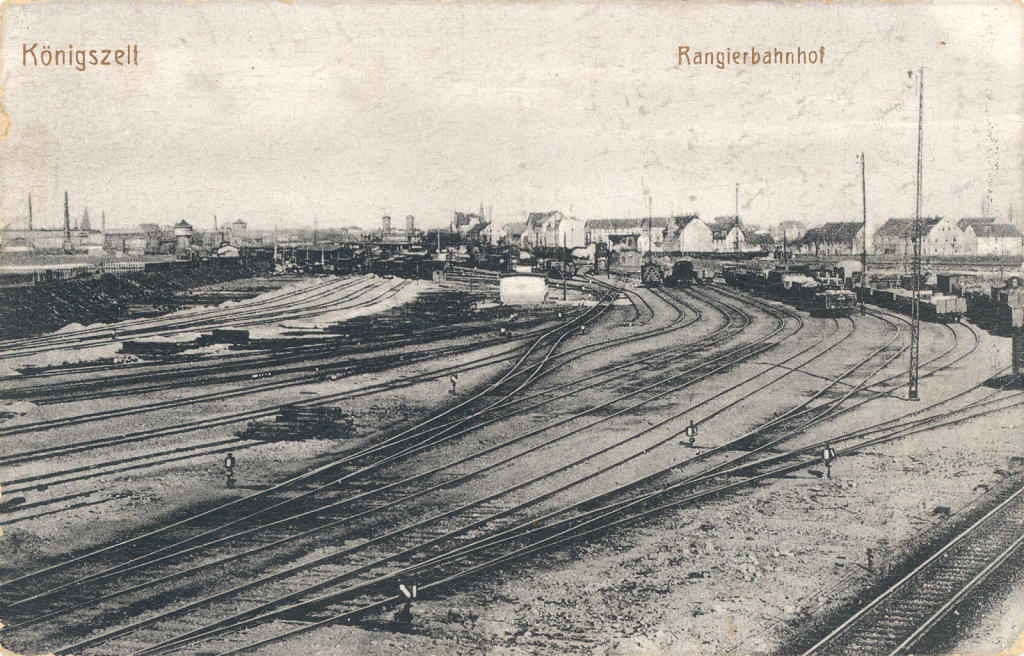 Wyspowy, pierwszy budynek dworca i peron wyspowy (obecny 2) w 1916 r. widziany od strony południowej: wjazdy z Wałbrzycha i Strzegomia. Za dworcem widoczne zabudowania słynnej fabryki porcelany "Karolina".