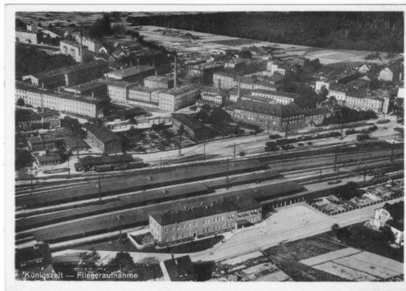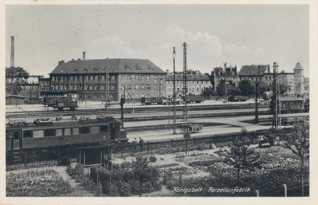 Widok na stację kolejową w kierunku północnym. U doły widoczny nowy budynek dworca, dalej perony i ekspedycja towarowa. Następnie rozległe zabudowania słynnej fabryki porcelany "Karolina", która do lat 90. XX wieku eksploatowała bocznicę kolejową. W prawo wyjazd na Wrocław i Świdnicę, w lewo kierunku Wałbrzych i Legnica.