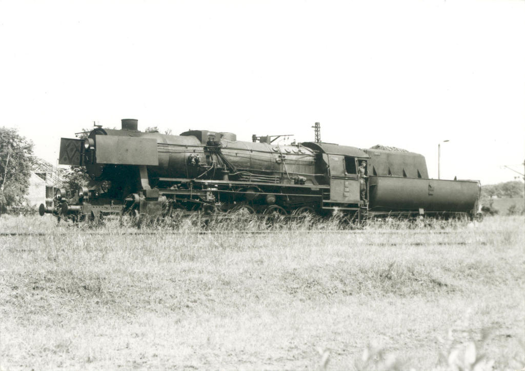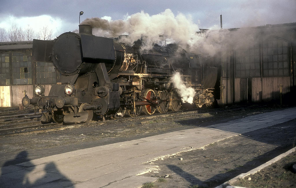 Jeden z teigreków odstawiony na torach trakcyjnych jaworzyńskiej lokomotywowni przy wyjeździe na Wrocław. Ze zbiorów W tle budowane wtedy bloki przy ul. Kościelnej. Adama Pacześniaka.
