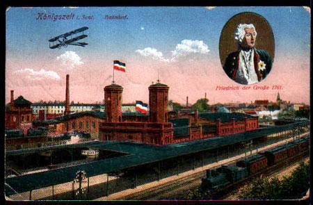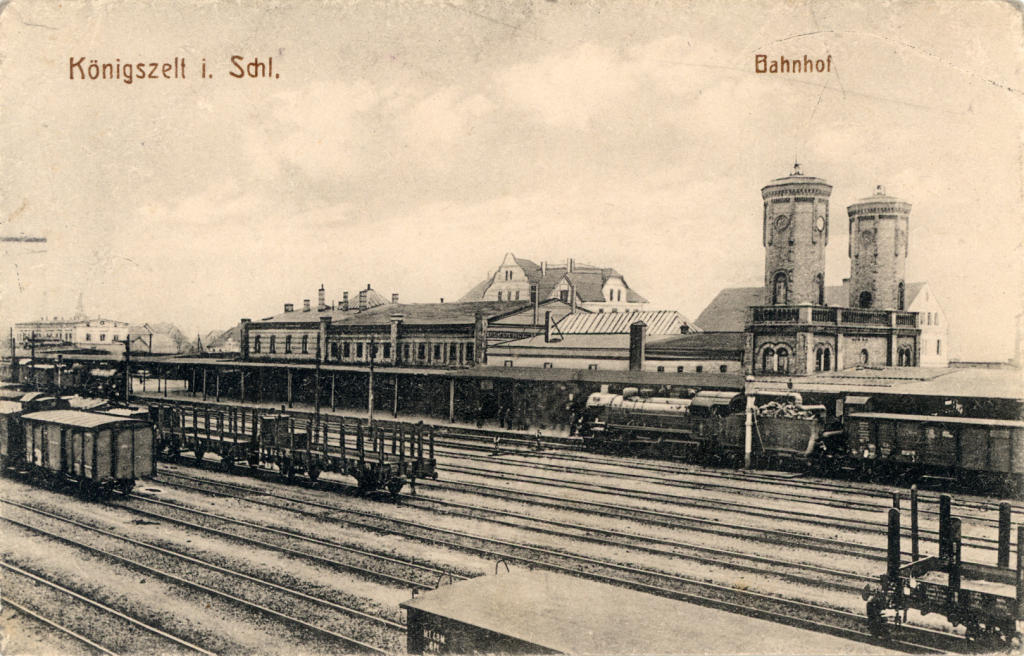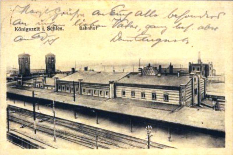 Wyspowy, pierwszy budynek dworca i peron wyspowy (obecny 2) w 1914 r. widziany od strony południowej: wjazdy z Wałbrzycha i Strzegomia. Za dworcem widoczne zabudowania słynnej fabryki porcelany "Karolina".