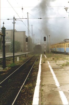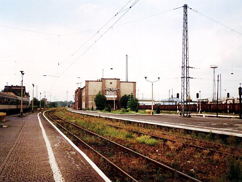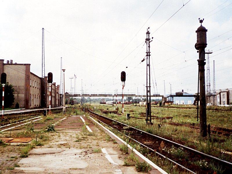 Towarowa część układu torowego widziana od strony wjazdu z Legnicy i Wałbrzych w kierunku północno-wschodnim. W tle widoczne zabudowania dworcowe. Ze zbiorów Adama Pacześniaka.