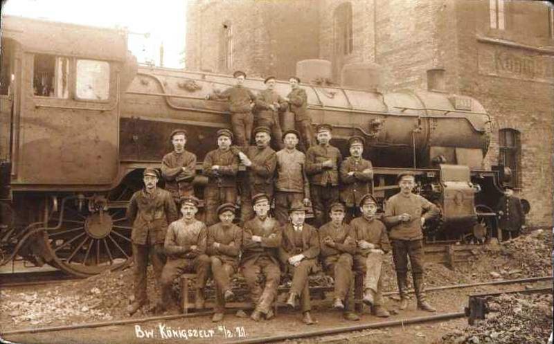 Pracownicy parowozowni na tle lokomotywy i zabudowań kolejowych.