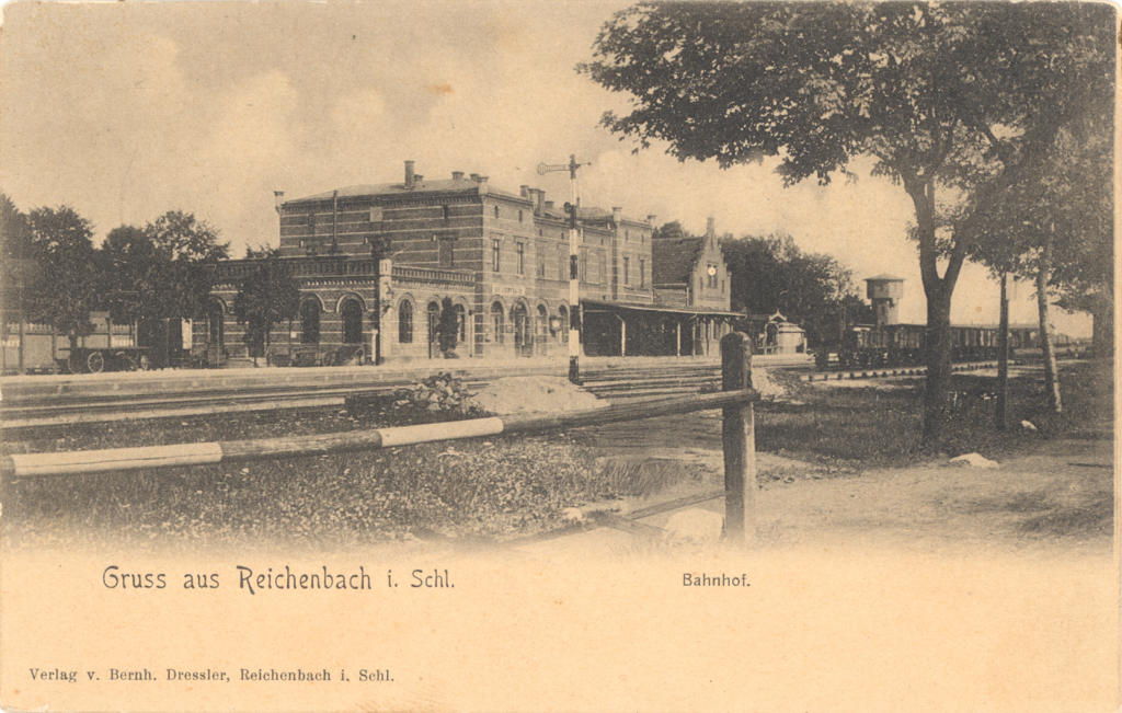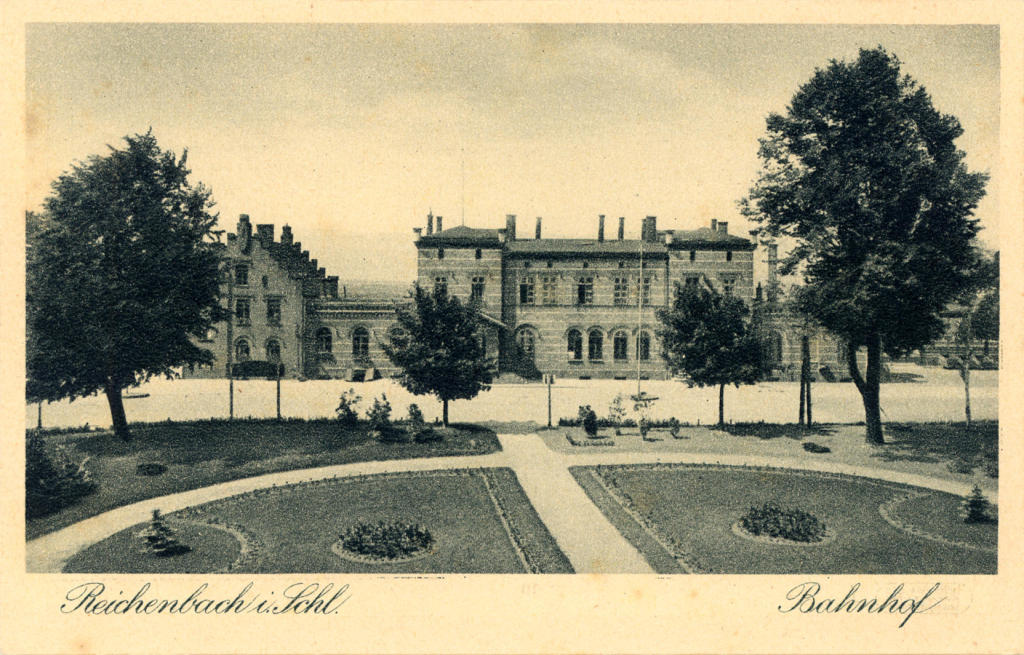 Budynek dworca od strony podjazdu. Widok w kierunku południowo-zachodnim; w lewo Piława Górna, Bielawa, w prawo Świdnica i Pieszyce. Pocztówka ze zbiorów Adama Pacześniaka.