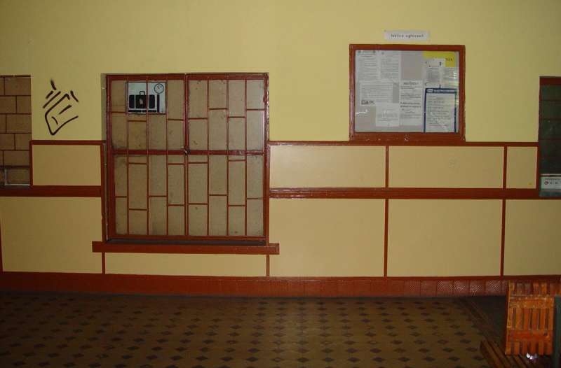 Poczekalnia na dworcu i okienko kasy bagażowej.